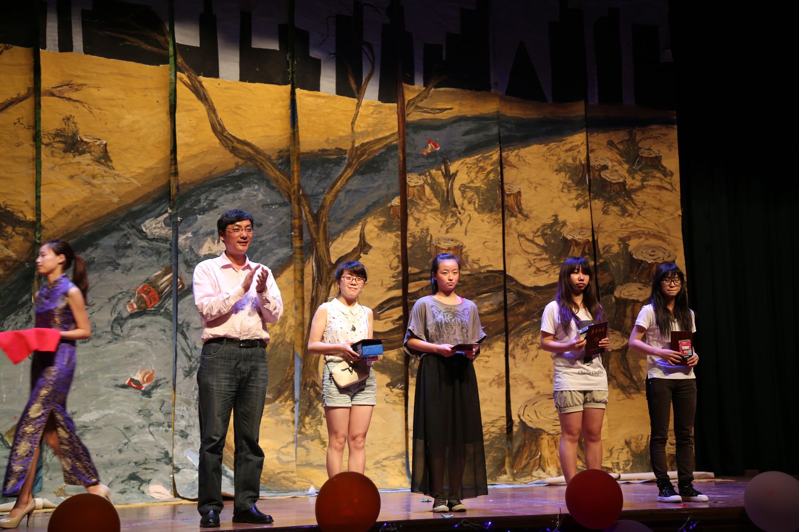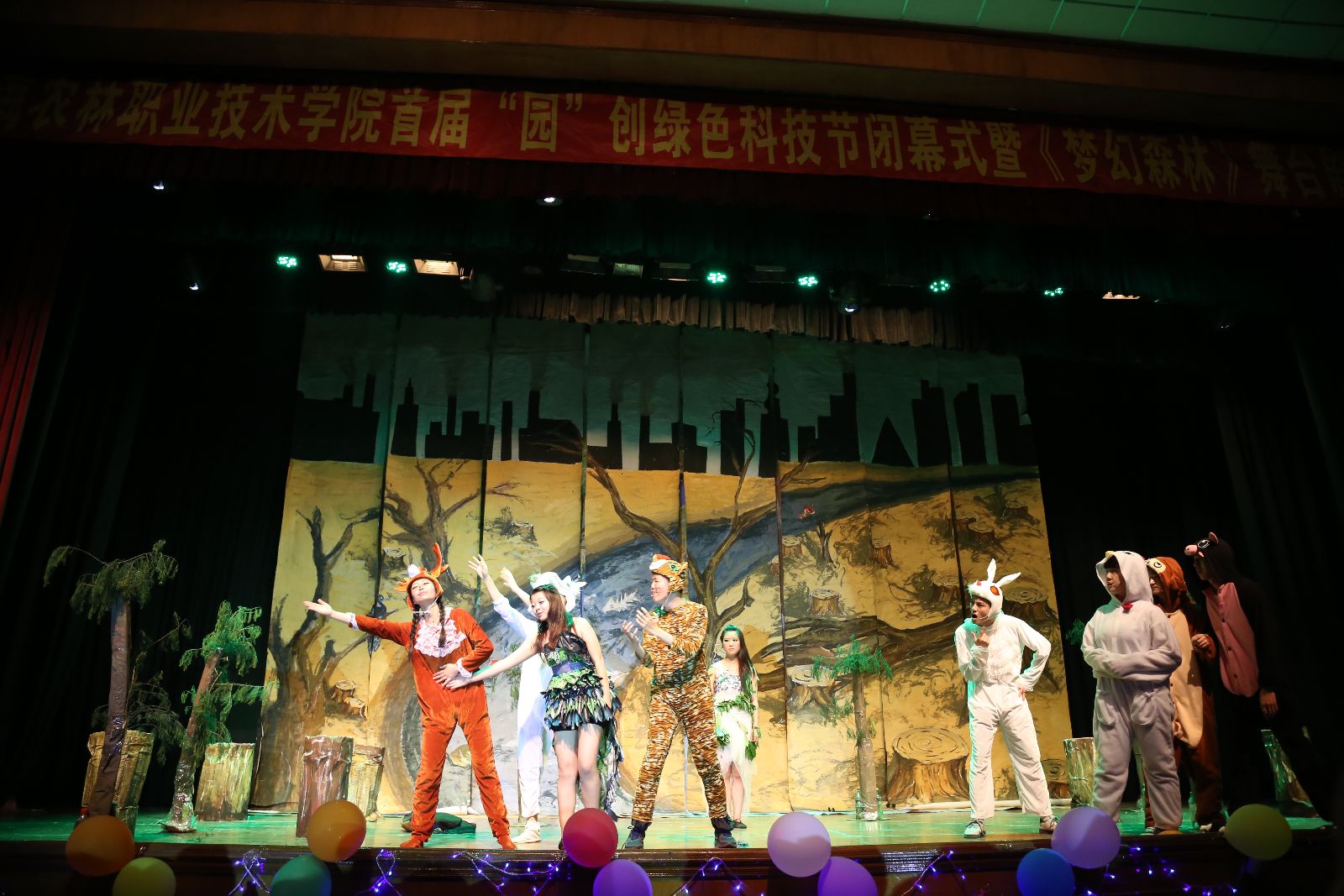 在颁出科技节各活动奖项后,师生们观看了由园艺园林系同学自编、自导、自演的原创舞台剧《梦幻森林》表演,该剧以二位记者在原始森林中的亲身经历为蓝本,通过形象的表演,揭示了近年来森林的乱砍乱伐给人类环境带来的巨大危害,从而烘托“园”创绿色科技节“绿色、低碳、环保、尚农”的主题,演出取得了圆满的成功。