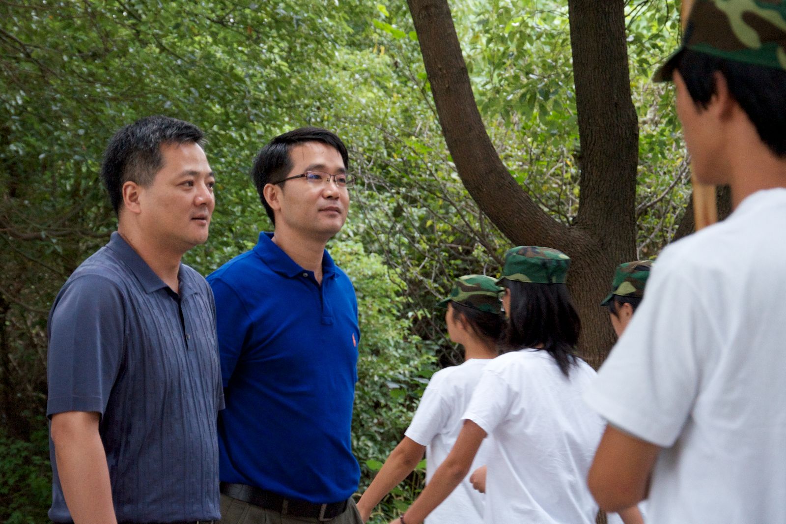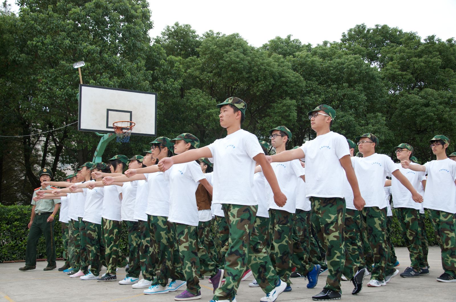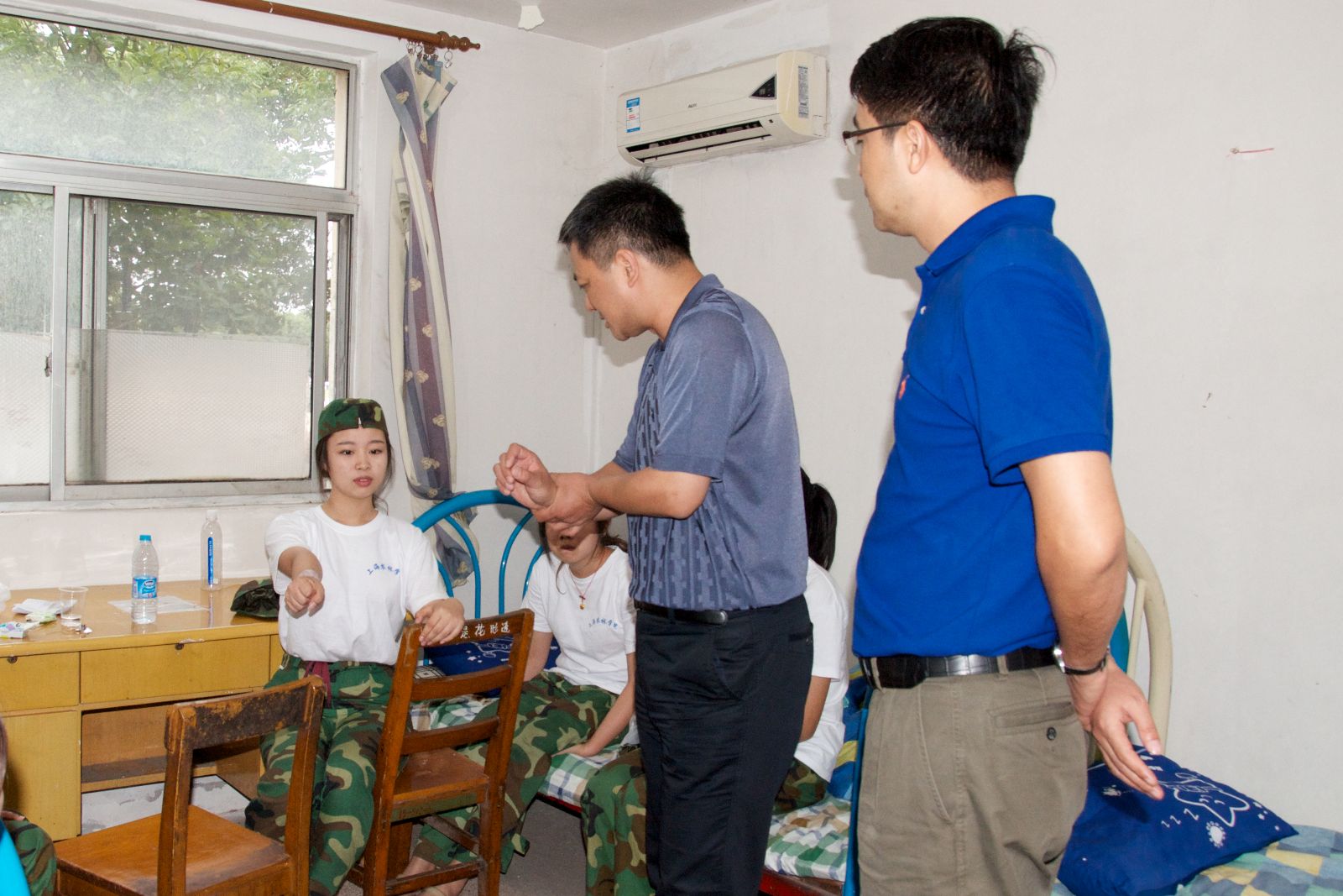 在锦绣园基地,学院领导检阅了受训学生方阵,利用军训间休时间与军训教官、同学们进行了亲切的交谈。随后,看望了生病学生、了解学生住宿及饮食情况,并代表学院为学生们送上了新鲜水果。