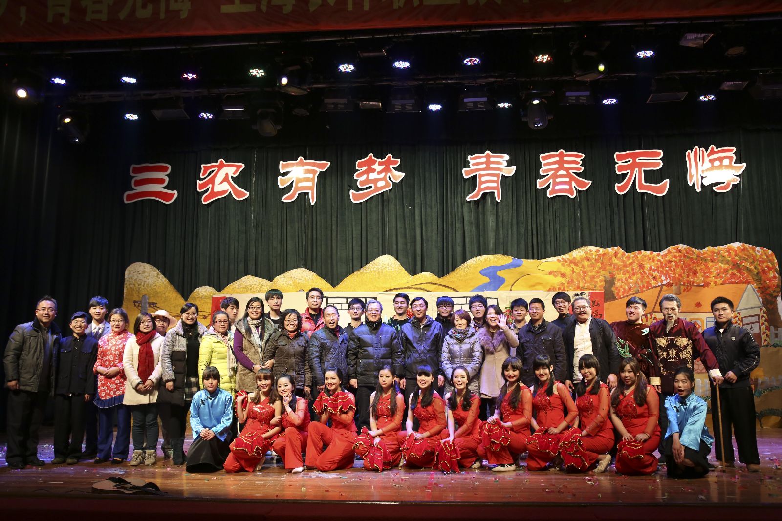 伴随声声新年的祝贺,交织着礼炮、掌声和欢呼,12月26日,“三农有梦,青春无悔”2014年元旦文艺汇演在学院大礼堂隆重举行。学院党政领导吴乃山,俞锦禄,王军亮,费国强以及相关职能处室负责人,各系学生工作负责人,团总支书记及学生代表等1000余人观摩了演出,共庆元旦佳节的到来。