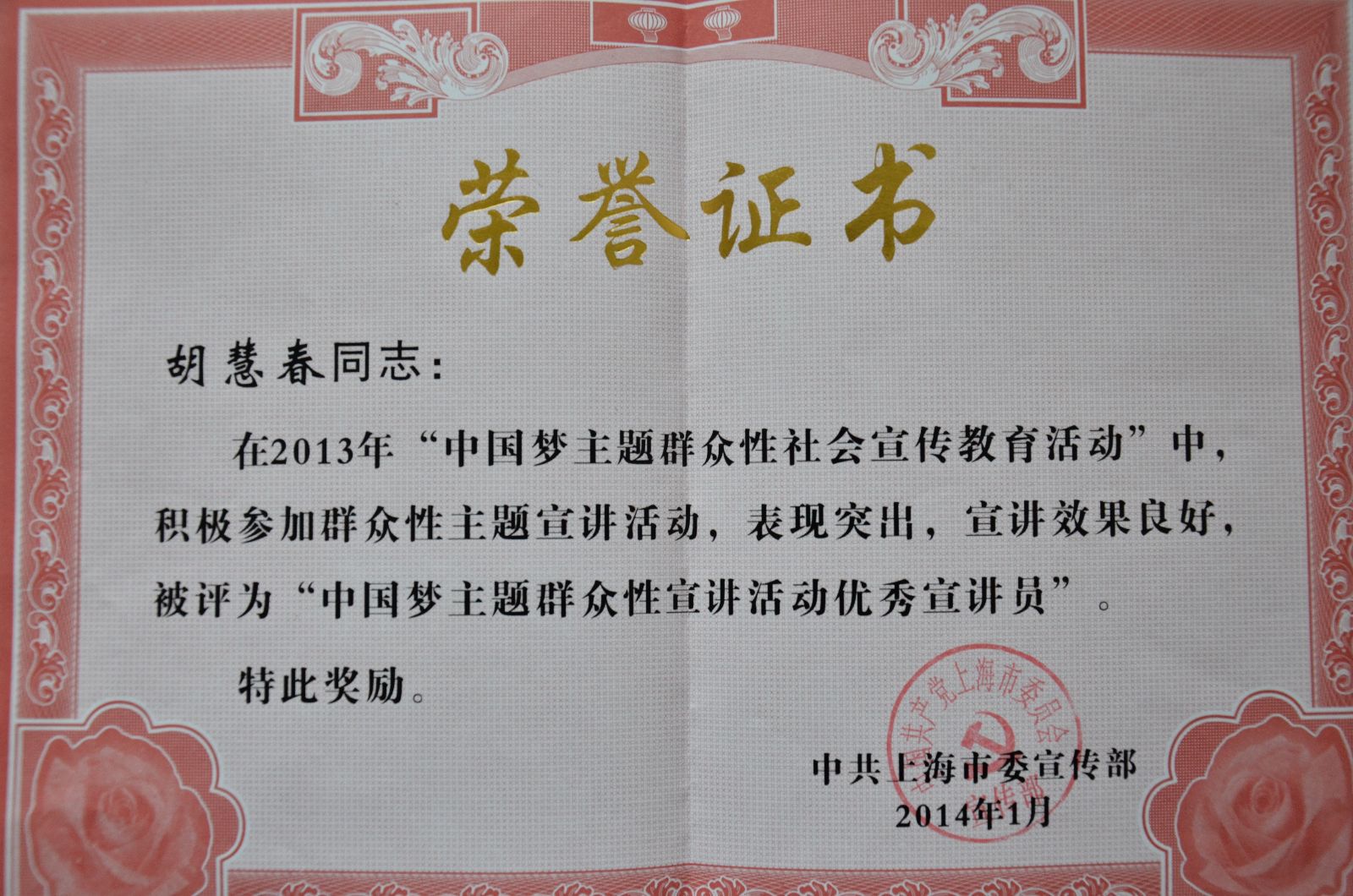 院团委自开展“我的中国梦”主题教育实践活动以来,坚持从实际出发,结合我院学生特点,设计开展了一系列符合时代需求,青年喜爱的主题实践教育活动,并在由中共上海市委宣传部、精神文明建设指导委员会办公室、上海市互联网信息办公室主办的中国梦主题群众性社会宣传教育活动表彰中,获得“我的中国梦”主题实践教育活动获优秀项目,胡慧春同志获“中国梦主题群众性宣讲活动优秀宣讲员”荣誉称号。