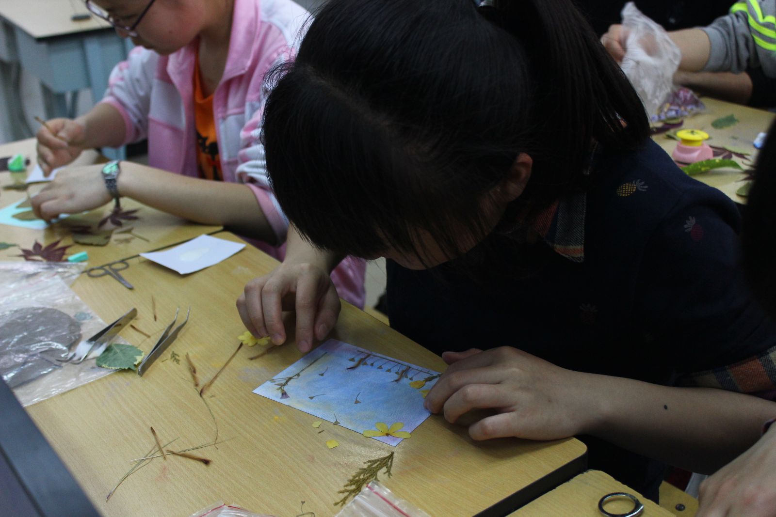 本次活动以“走近压花,走近自然”为主题,旨在向全校学生普及压花知识,展现压花魅力,提高学生专业素养。活动由园艺园林系科普社主办,科普社社长首先向大家介绍了压花的制作方法,接着以互动的形式教大家如何制作压花贺卡。在场的同学无不被压花的魅力深深吸引,大家积极踊跃的参与到亲自制作压花贺卡的活动之中。从图案的设计到压花材料的修剪再到压花板的镇压,每一个动作、每一个细节、每一次修剪,同学们丝毫不敢马虎,唯恐一不小心植物的美丽就要流逝似的。时间在指尖流淌,美丽在指尖呈现。通过用心的勾绘与制作,一幅幅压花作品不断的呈现在我们的眼前,在作品塑封成型的那一刻,同学们脸上绽放的笑容也如同这些“彩色的思念”一样,动人到让人心醉。