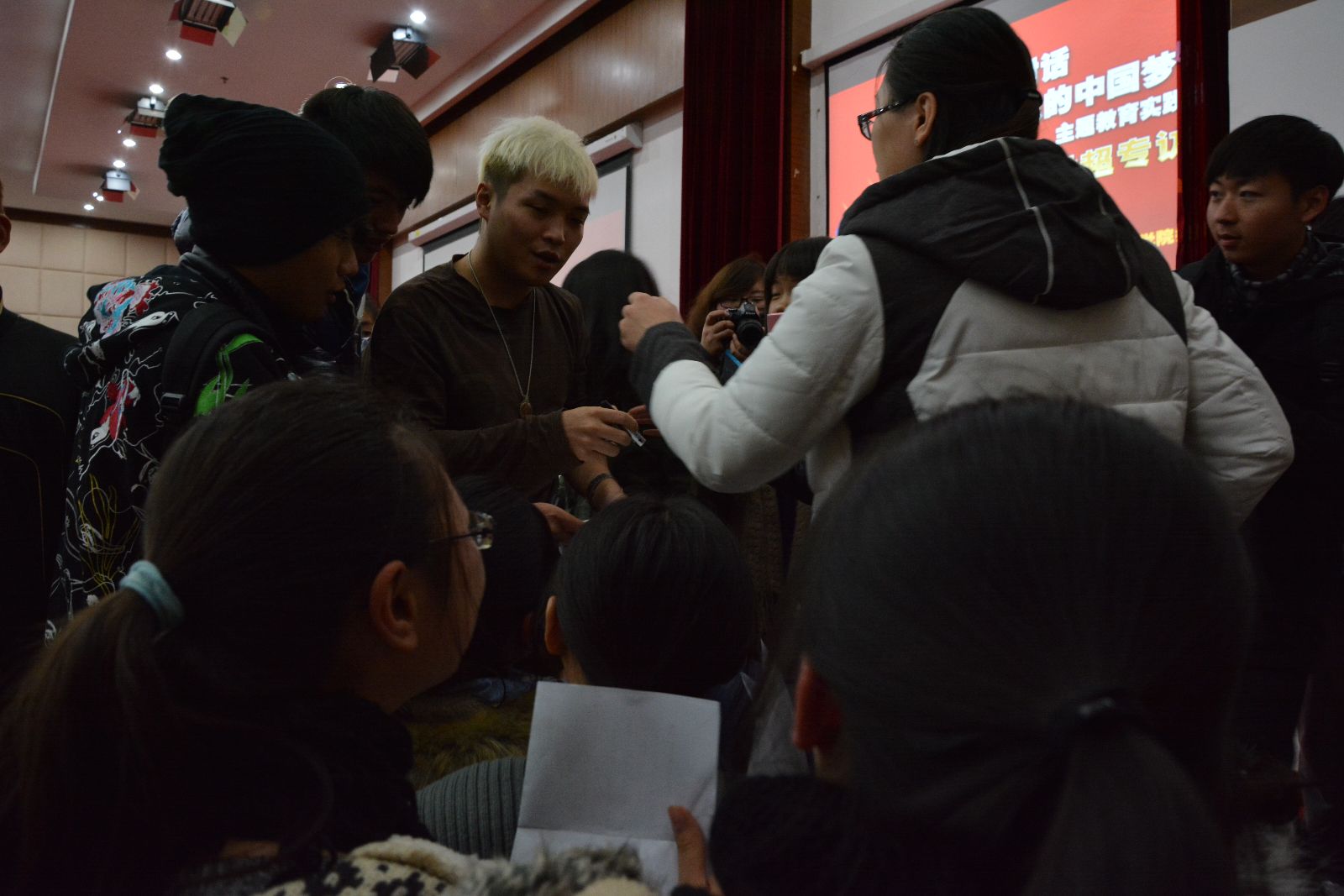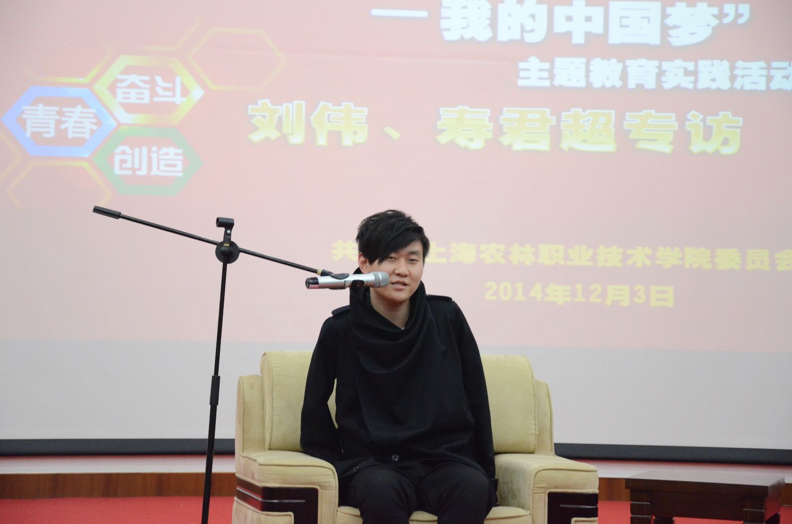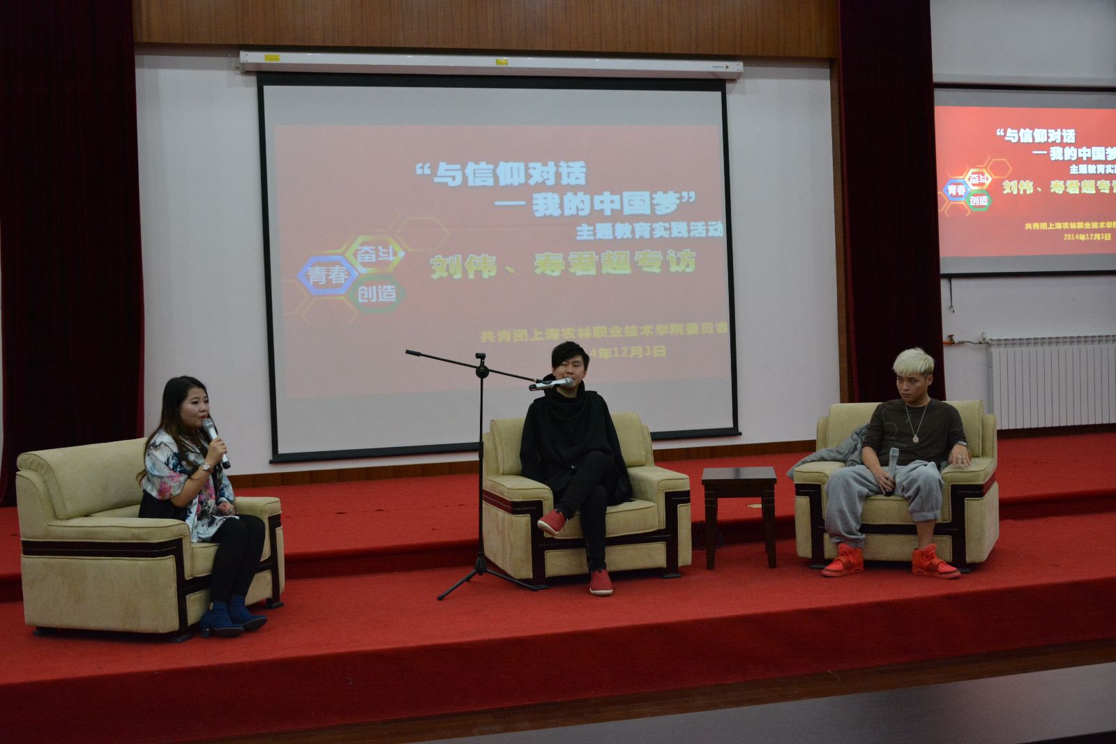 12月3日,“与信仰对话——我的中国梦”主题教育实践活动在综合教学楼报告厅举行,活动邀请到了2010年中国达人秀总冠军刘伟和同期达人秀人气选手、Rap歌手寿君超,两位嘉宾与在场的400余名学子畅谈梦想,共享人生乐趣。
