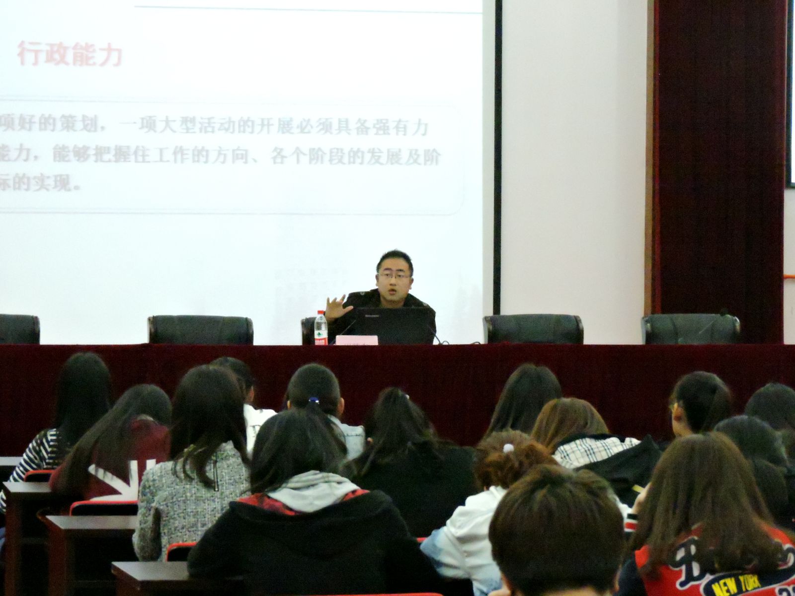 4月21日,2015年团学干部培训班第三讲在综合楼学术报告厅举行,团委副书记胡慧春老师就《优秀团学干部的能力建设》为200余名团学干部、干事作了专题讲座。