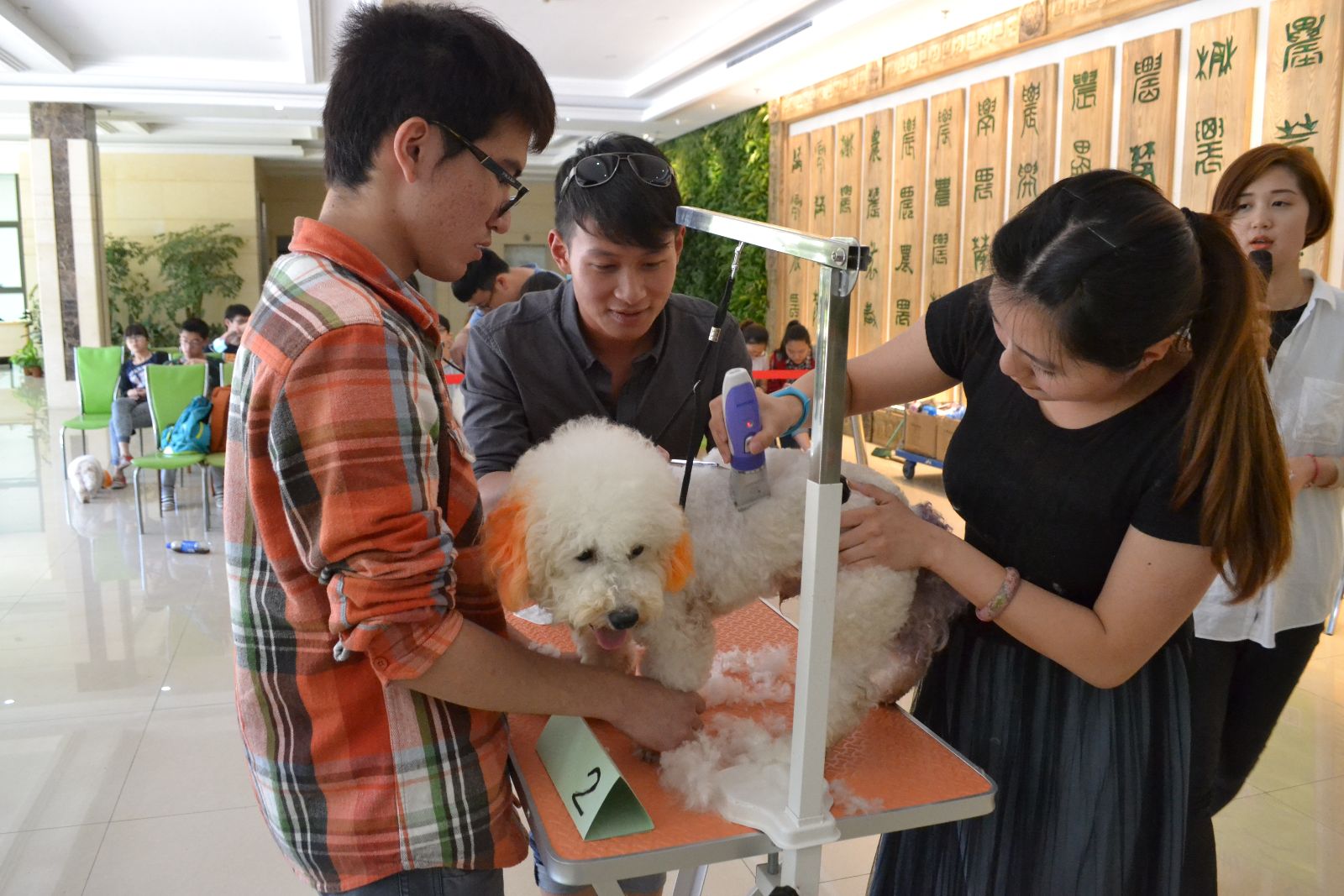 本次比赛面向学院所有爱宠学生,共8支队伍参赛,每队3-4人,分为大一组、大二组,分组竞技,在规定时间内完成毛发修剪、造型设计。各组参赛成员手法专业,合作默契,在有限的时间内对狗狗进行改头换面的改造。他们充分利用手中被分配到的装饰品,发挥想象力,把狗狗打扮的富有创意、憨态可掬。比赛中也有些小小的波折,有的狗狗胆小,一上美容台就全身发抖、缩成一团,有的狗狗活泼好动,修剪中东窜西逃、不受摆弄,选手想方设法安抚它们顺利完成美容、造型。经过两组、60分钟的比赛,由评委评分和现场观众点赞后,大一组的王延廷、李雯洁、应姗,大二组的田茜之、朱佳慧、董晓芸、曹逸飞分别获得所在组的冠军。