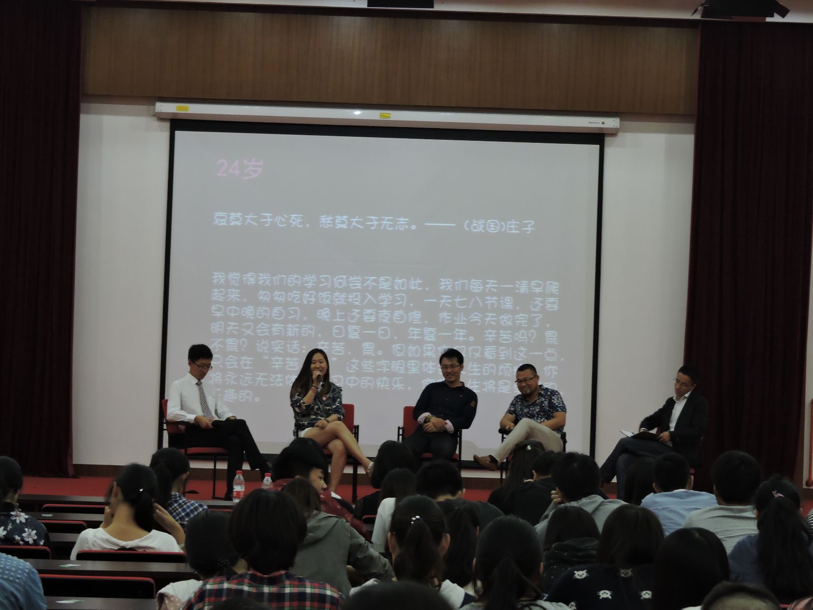 活动第一部分以事迹宣讲为主,通过鲜活生动的奋斗故事现场分享了园林142班徐兵、生物051 班阮斌、动医103班王超和商管052班于葳的青春故事。第二部分以现场访谈的形式进行,动医041班张新怡通过专业学习、工作体验告诉同学们要坚持自己的梦想,为自己的人生梦想努力奋斗;园林113班金沁赟告诉同学们在校期间要不断参加各类活动,积累经验,锻炼自己的综合素质和能力;园林093班蒋正欢和环境112班涂晨阳结合自身创业经历,讲述了自己创业之路中的苦辣辛酸。活动现场气氛热烈,他们用朴实的语言和真实的感受与现场师生分享了他们不同的成长心路,号召广大青年坚持理想、脚踏实地、乐于奉献、敢于担当。