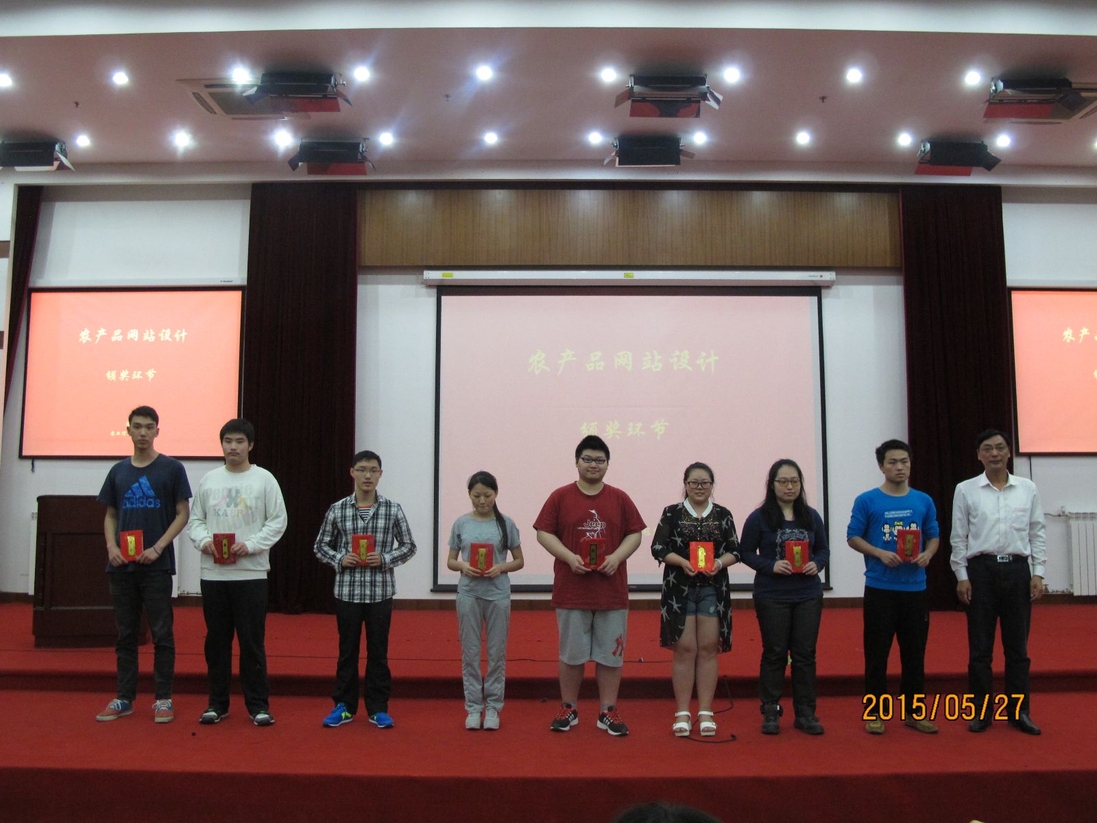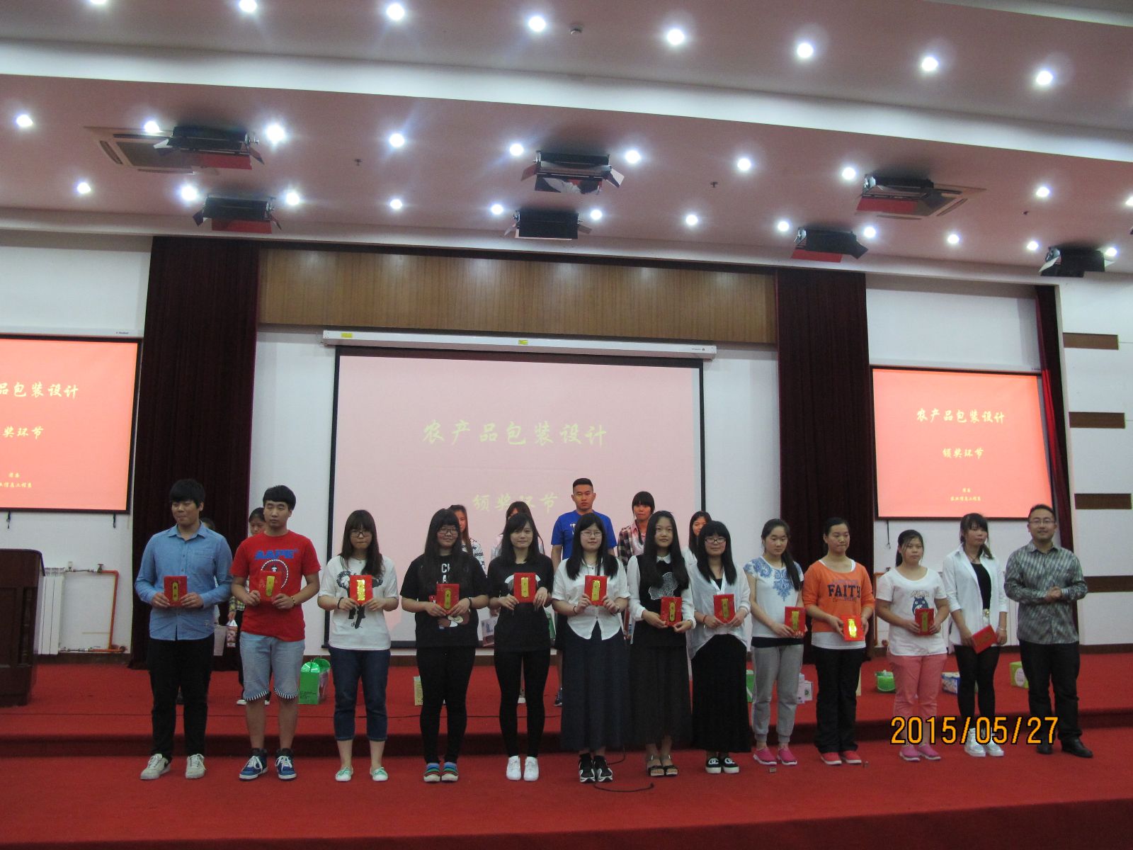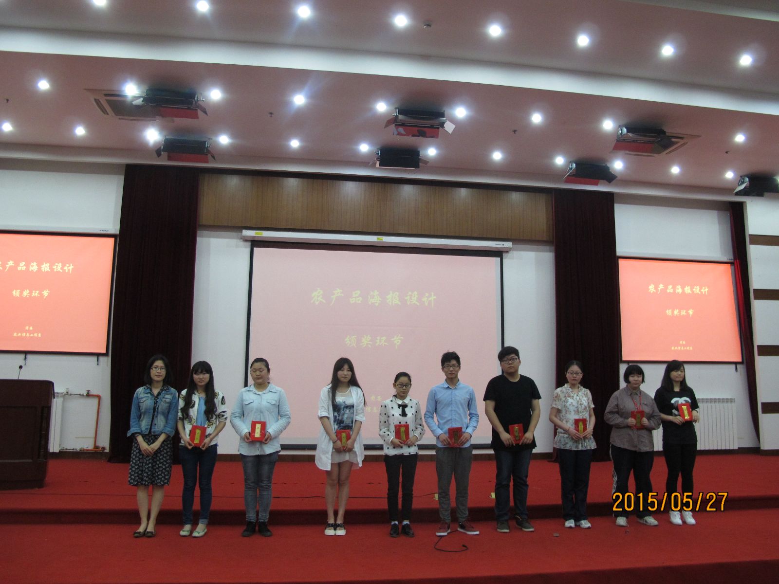活动现场对农产品包装大赛和农产品安全海报大赛进行颁奖,获奖学生代表陈宸和程昊星2位同学对作品的设计理念进行了分享。