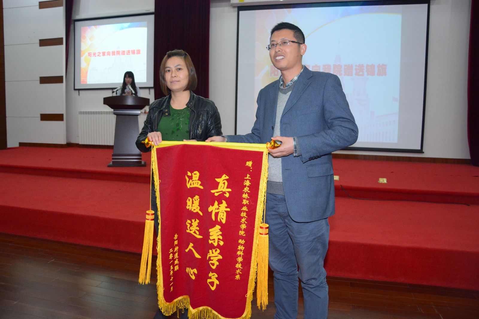 会上,岳阳街道残联副理事长庄凤英女士代表阳光之家向我院动科系赠送锦旗。