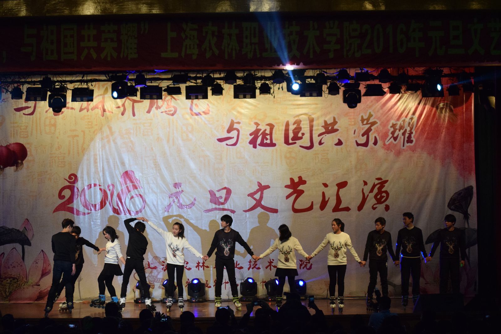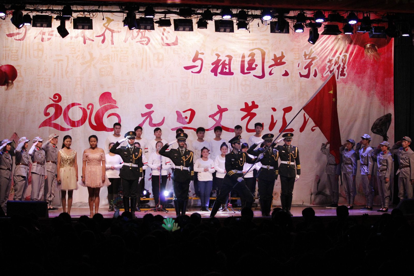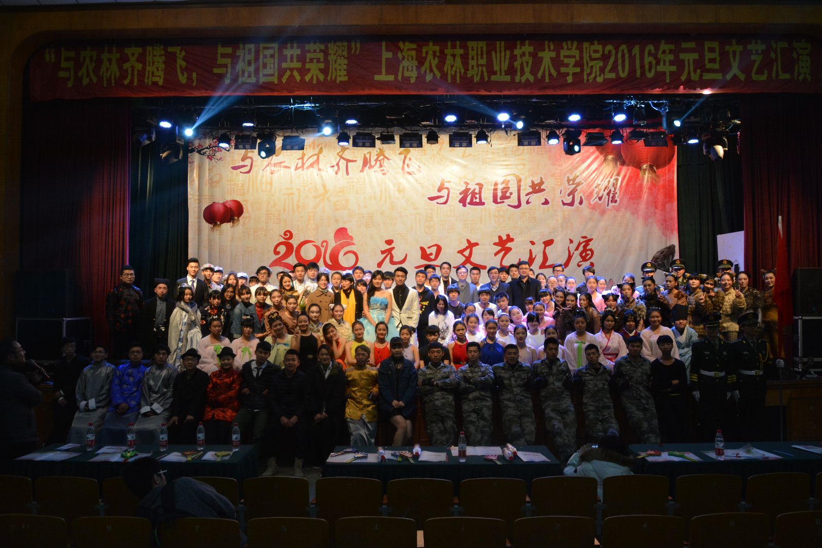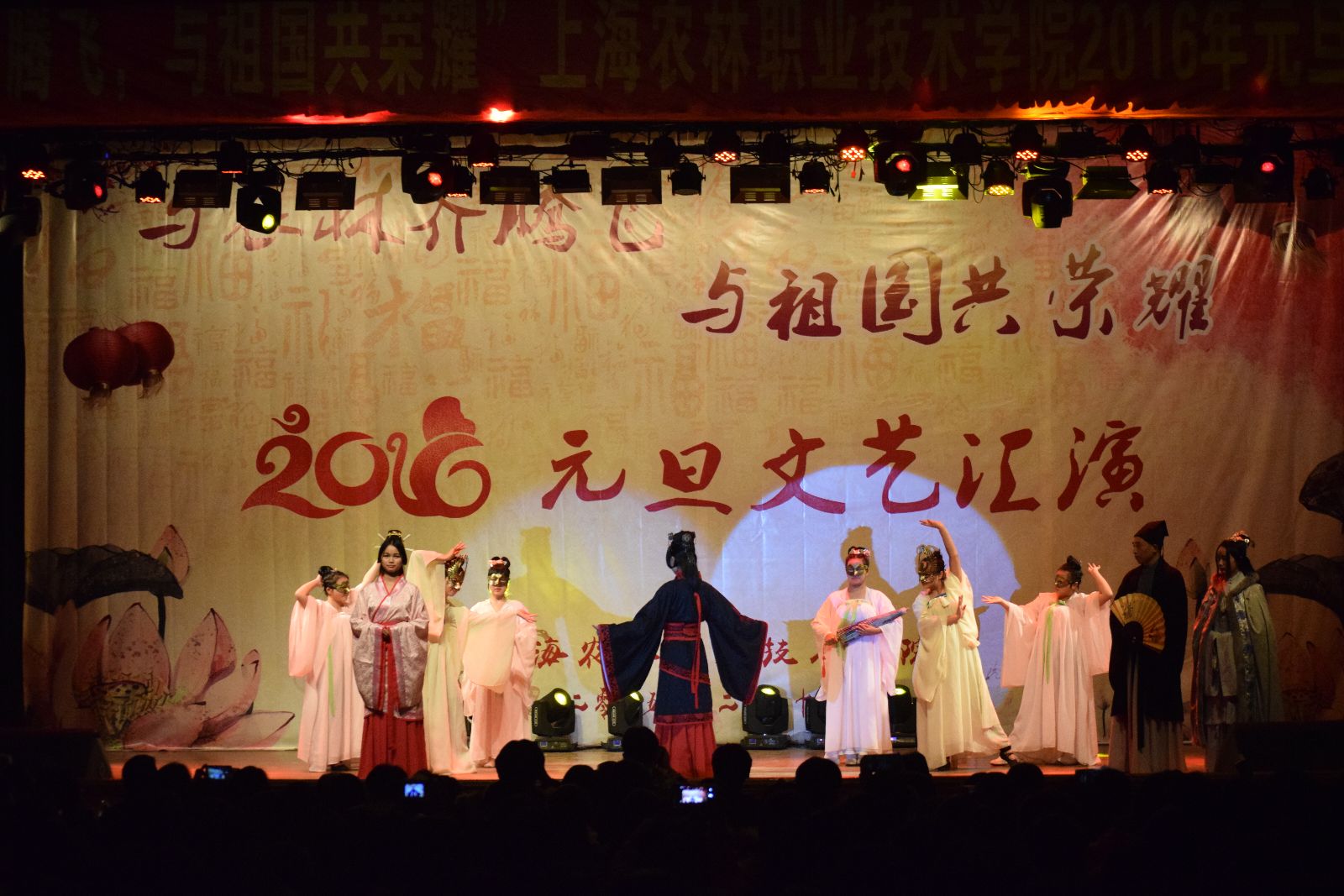 12月29日,由院团委主办的“与农林齐腾飞 与祖国共荣耀”2016年元旦文艺汇演在大礼堂举行。学院党政领导魏华、俞锦禄、高功辉、费国强以及相关职能处室负责人,各系学生工作负责人,团总支书记及学生代表等1000余人观摩了演出,共庆元旦佳节的到来。