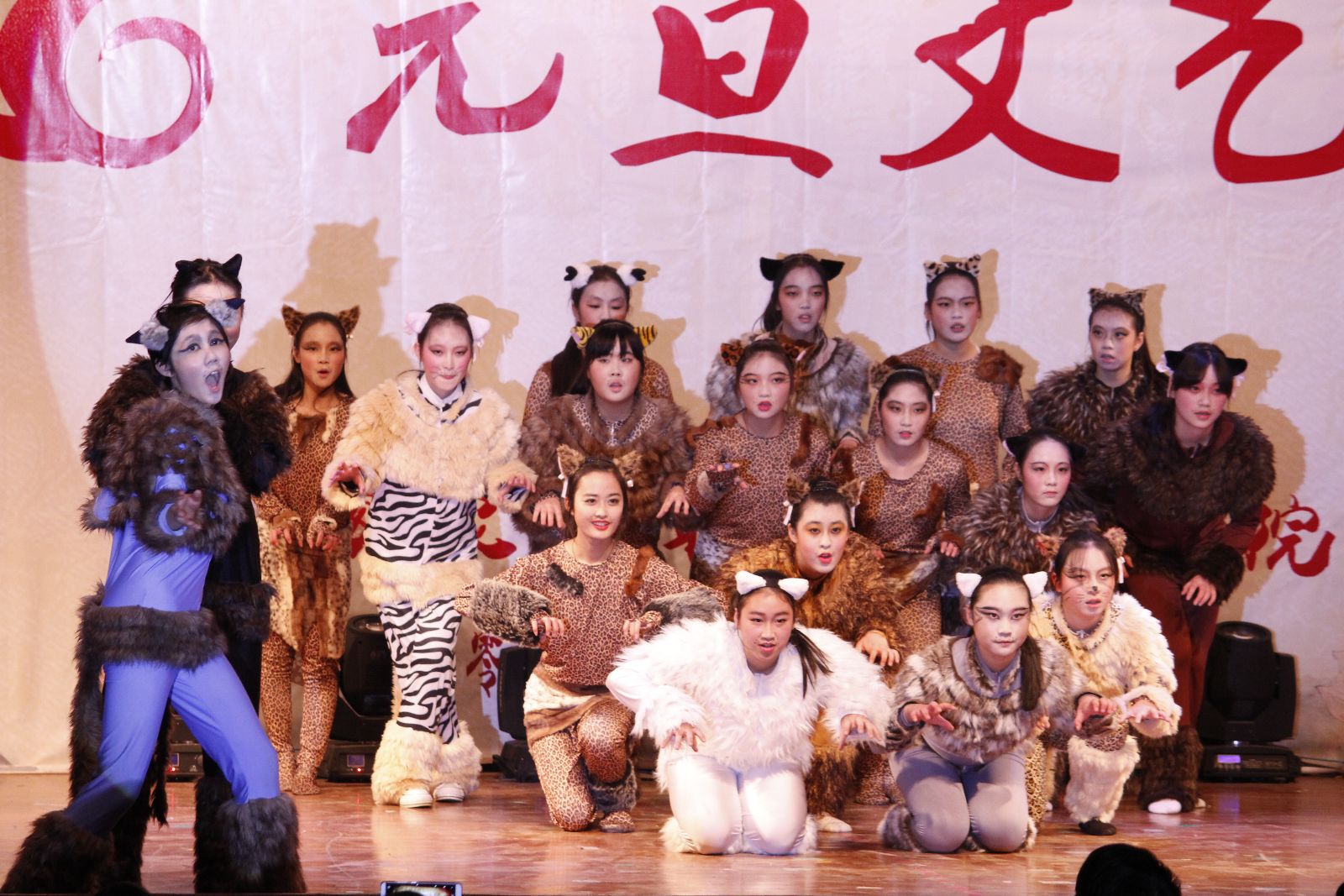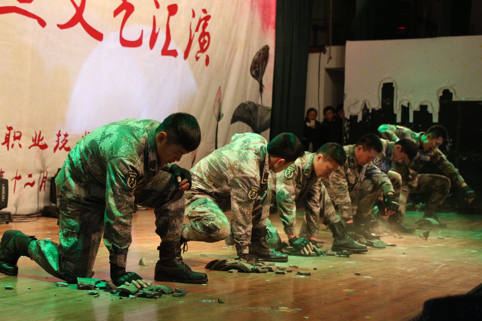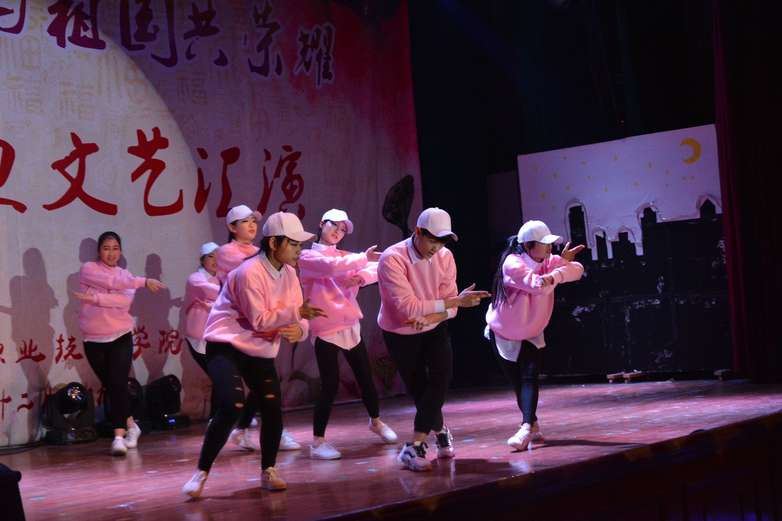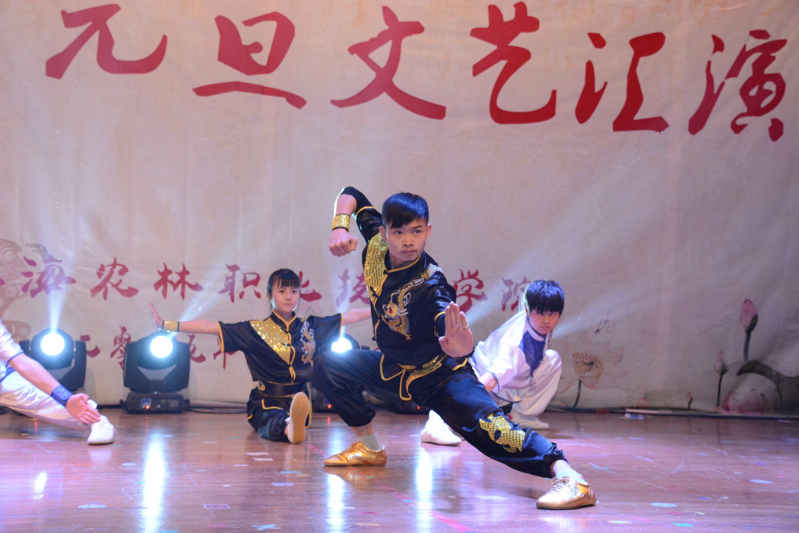 色彩斑斓的开场灯光秀让所有观众享受了一次视觉盛宴,现场气氛热烈,掌声雷动。晚会在热情奔放、大气磅礴的开场舞《龙鼓欢腾》中拉开序幕,现代舞《Call me baby》、女声二重唱《夜来香》、歌曲串烧《奔跑吧,青春》、音乐剧《猫》等用激情四射的热情凸显出以青春活泼为主旋律的青年文化的勃勃生机;瑜伽社、跆拳道社、旱地冰球社、武术社、汉宣社等带来的社团展示表演让更多师生了解到了校园文化的魅力;情景朗诵《青春中国》、小品《誓者》等向现场每一个人传递着铭记历史、缅怀先烈、珍爱和平、开创未来的美好愿望;从部队退伍的6位兵哥带来的军旅表演《我是一个兵》展示了他们绿色军营的风采和青年学生热爱祖国投笔从戎的赤胆忠心,更是将现场的气氛推向高潮。文艺汇演最后在歌伴舞《国家》的精彩表演中落下帷幕。