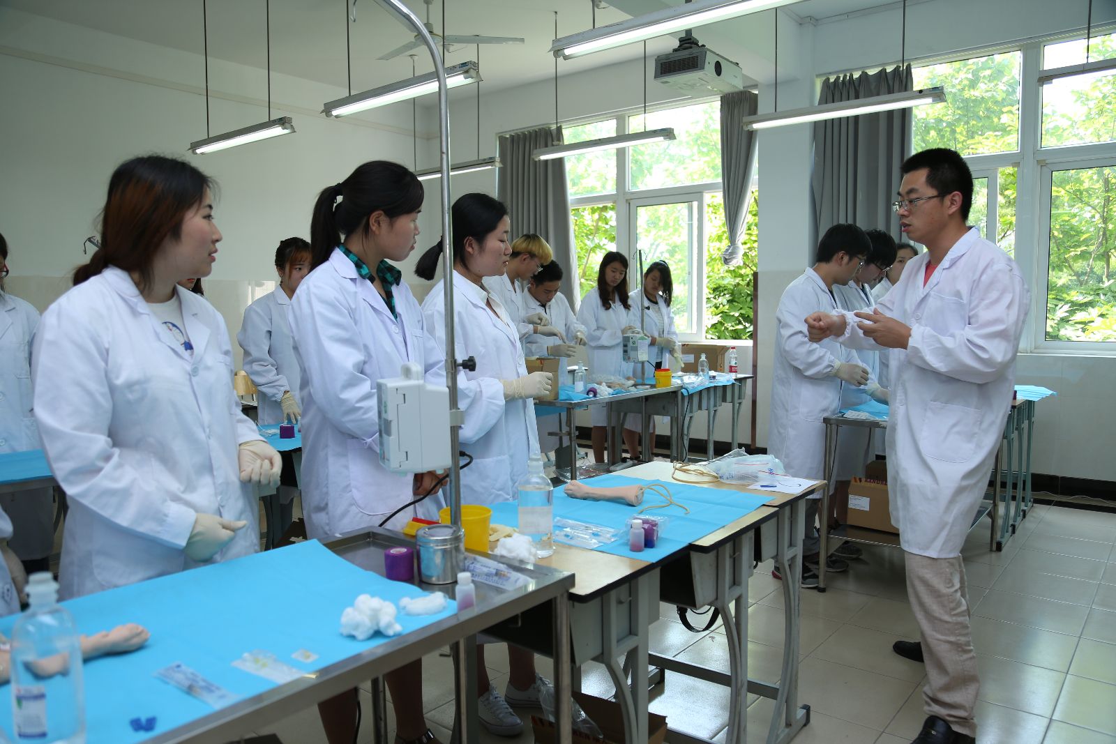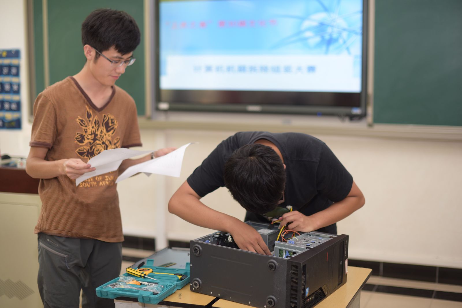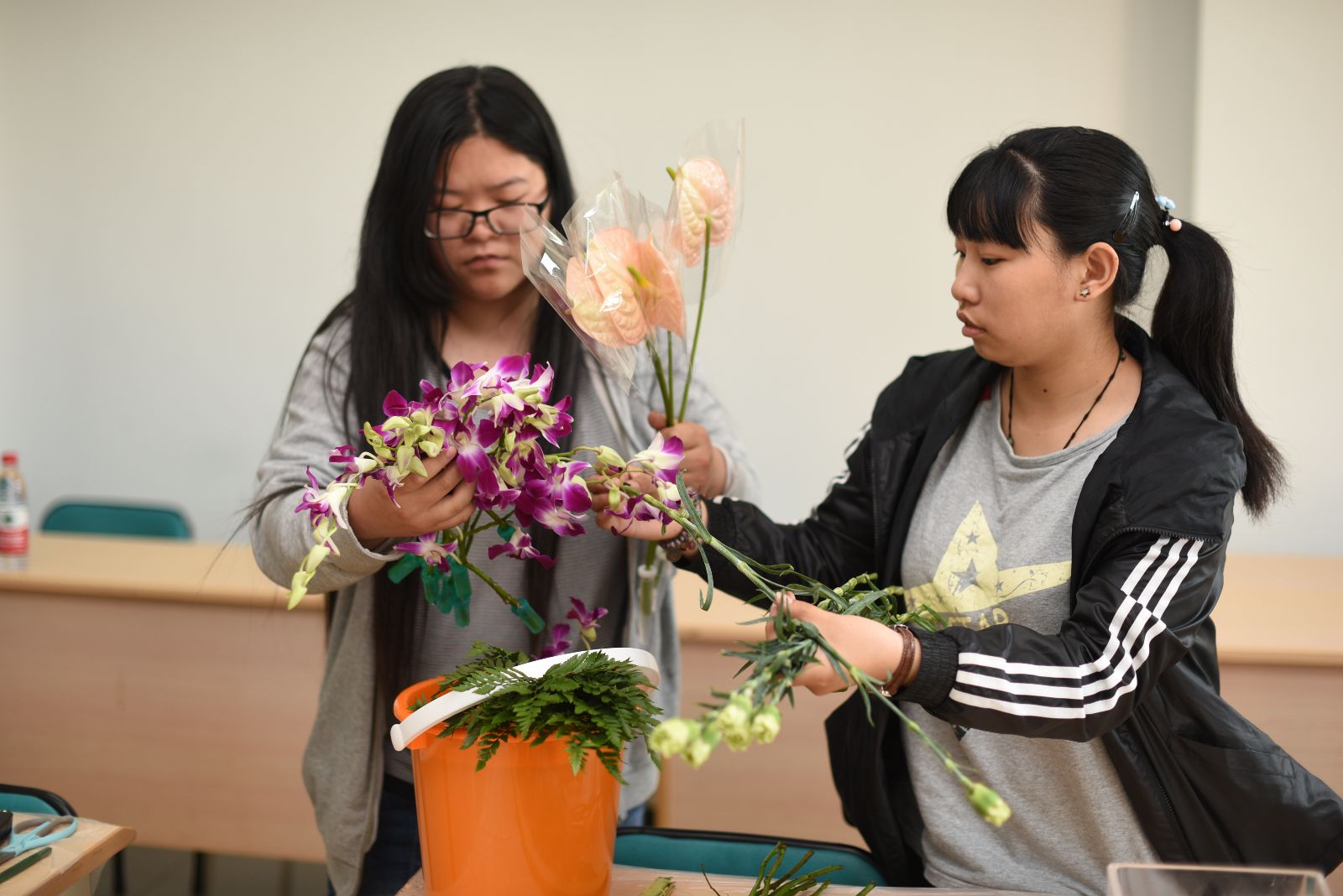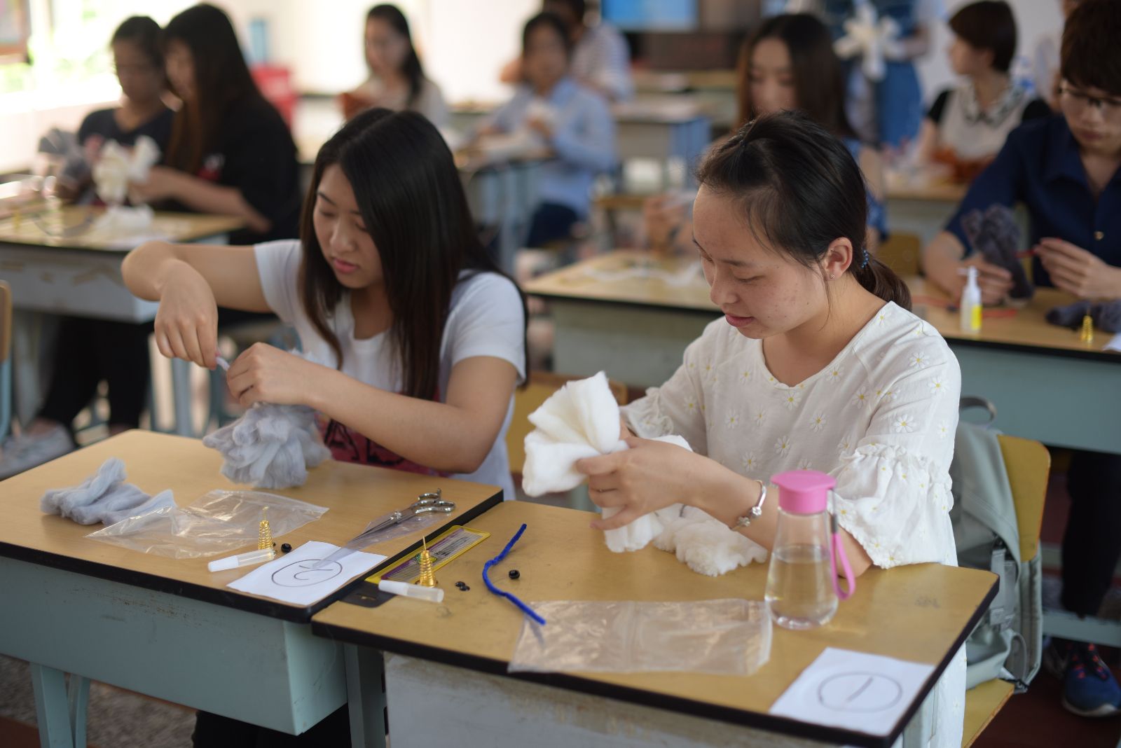 此次技能比武共分八个项目,分别为插花比赛、裱花大赛、花卉识别、宠物发型设计、犬前肢头静脉模型输液技能、茶味调和师、点钞职业技术大赛和电脑机箱拆装大赛,共计400余位学生参加。在宠物发型设计技能比武现场,选手们用宠物美容师练习用的羊毛毡套装制作宠物头型造型,经过1个半小时的制作和评委老师的悉心指导,选手们陆续完成了作品;在犬前肢头静脉模型输液技能比武环节中,选手们互相配合,助手保定犬只前肢,操作者固定前肢,并使其头静脉怒张,之后消毒、进针、回血、退针、旋紧肝素帽、固定留置针及静脉输液的过程都在有条不紊的进行中;花卉识别技能比武分专业组和非专业组,现场有红掌、杜鹃、大丽花等50种鲜花供参赛选手识别分辨,充分让同学们将理论所学联系到实践;在艺术插花比赛现场,选手们运用课堂上学到的花卉艺术知识,根据立意、构图、色彩搭配和创意等方面内容将花材与花器有机结合,塑造了一盆盆构思巧妙、造型别致的插花艺术作品;在电脑机箱拆装大赛比赛现场,选手们将电脑机箱、主板、内存、CPU、硬盘、电源、风扇等进行拆装,他们动作灵活娴熟,步骤有规有距,锻炼了同学们的动手能力;在点钞技能比赛过程中,参赛者严肃认真,使用单指、多指等多种点钞方式,在紧张有序的气氛中赛出了风格,赛出了水平,赛出了风采;茶艺技能比武则强调用科学的方法,充分展示茶的色、香、味、形,同时要求选手在展示的过程中要优美,做到茶美、器美、水美、意境美、形态美、动作美,让欣赏者充分得到物质和精神上的享受;在裱花大赛现场,选手们选食材,挤奶油、做雕花,形成了各种富有创意的图案,使作品看起来美味诱人。师生们在观赏作品时说道:“这些作品立意新颖、造型精美,让我们都难以割舍。”