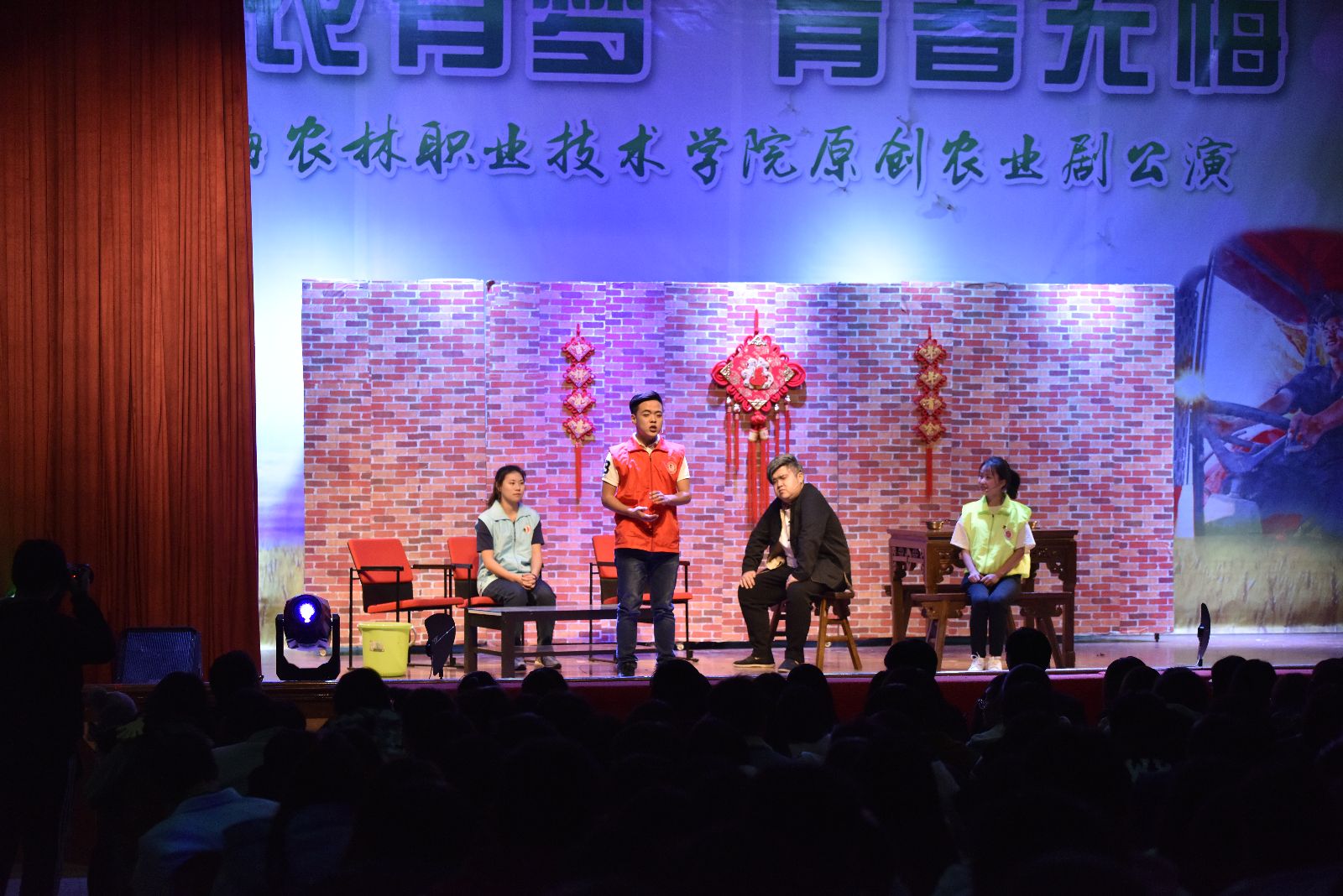 该剧首演于2013年,由我院师生自编、自导、自演,从剧中人物在农村生活的点滴出发,将新农村、新农业、新形势以精彩的演出节目、幽默诙谐的人物对白、发人深省的剧情碰撞激发青年学子投身农业的热情。此次演出,在原有基础上对剧情、舞美、道具等方面又进一步做了加工和调整,同时在剧情中以服务学生为宗旨,把学生资助政策、创新创业、心理健康、宿舍管理等内容进行了融合,进一步激发学生自强自立意识。