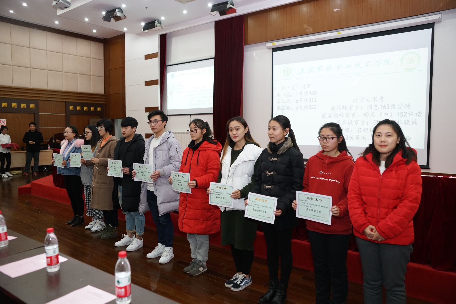 各系团总支书记分别为寝室服装设计大赛、我“室”冠军、地方大家秀、积极分子等30余名获奖学生进行颁奖;荣获地方大家秀活动“最富韵味家乡”、“最热辣家乡”、“最异域家乡”称号的三位同学在闭幕式上再次分享了他们家乡的风土人情。