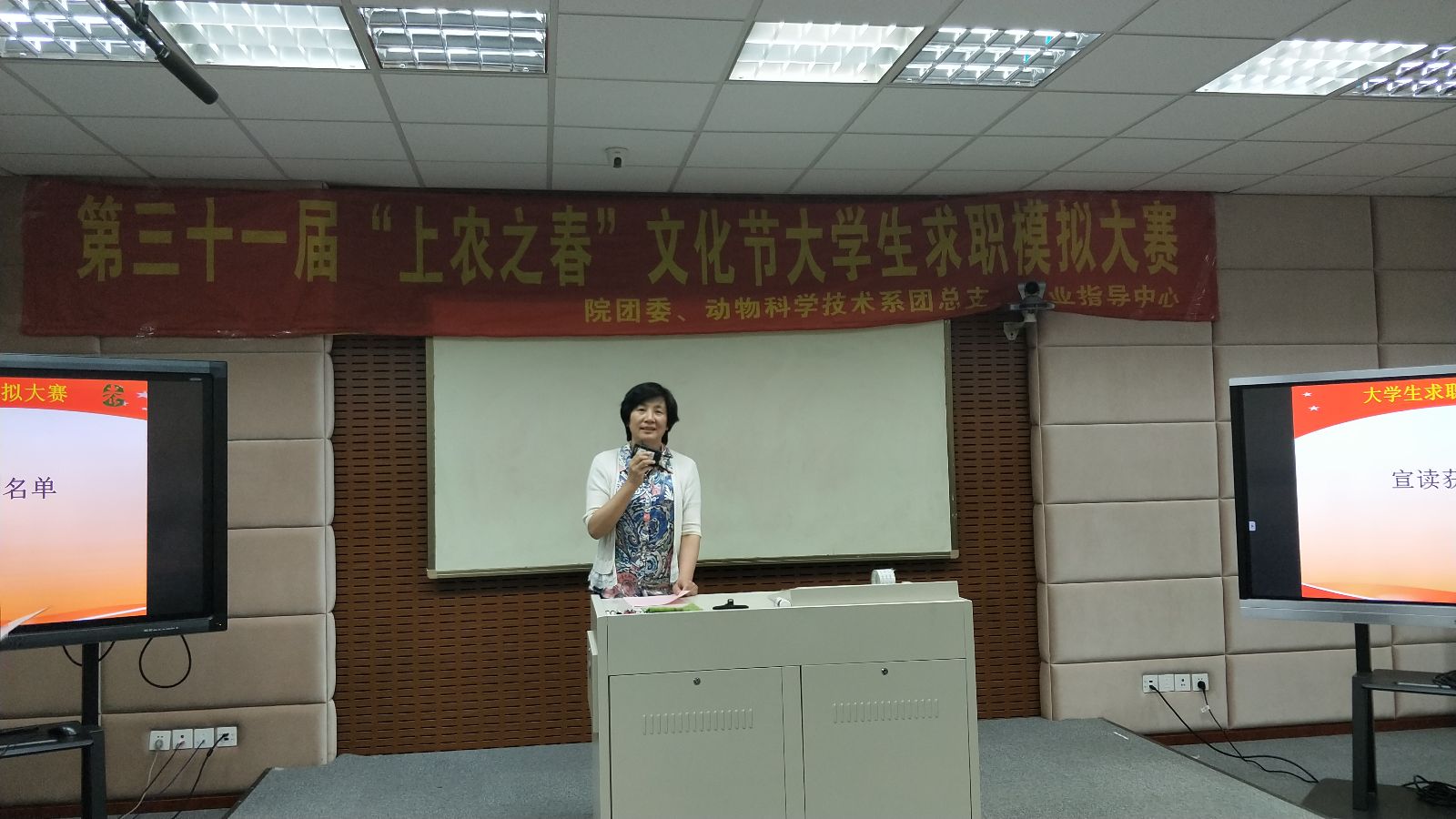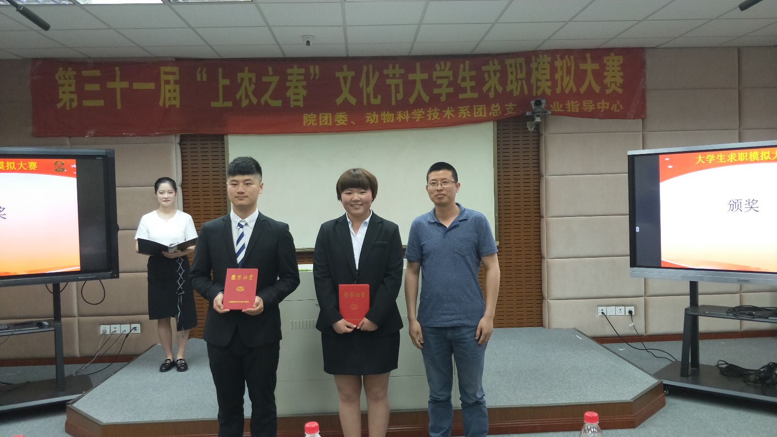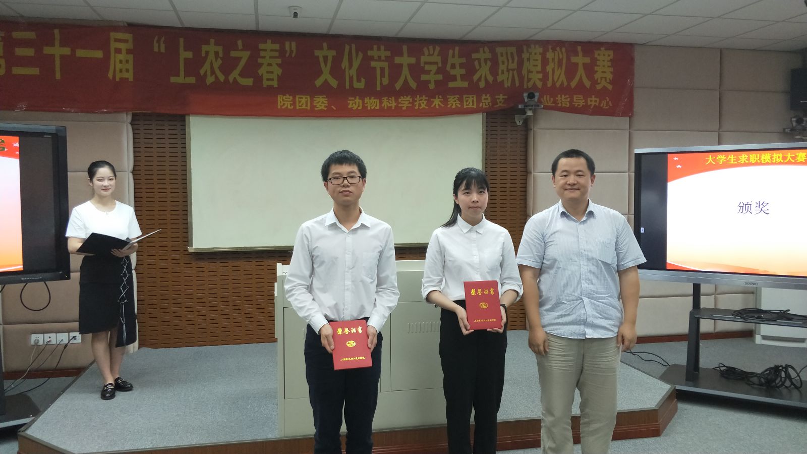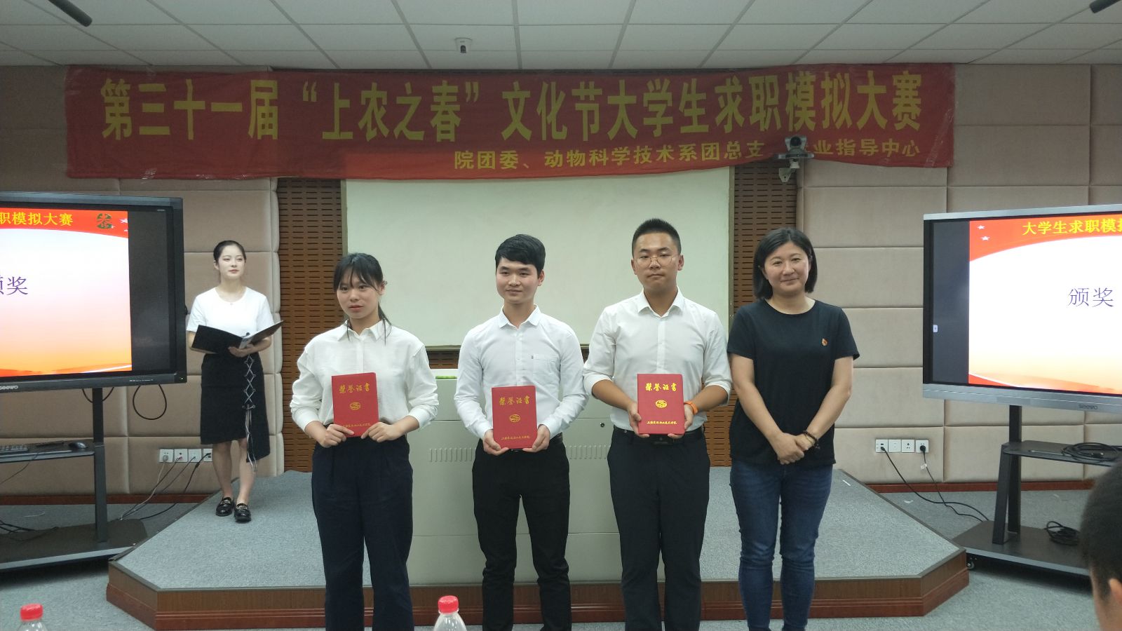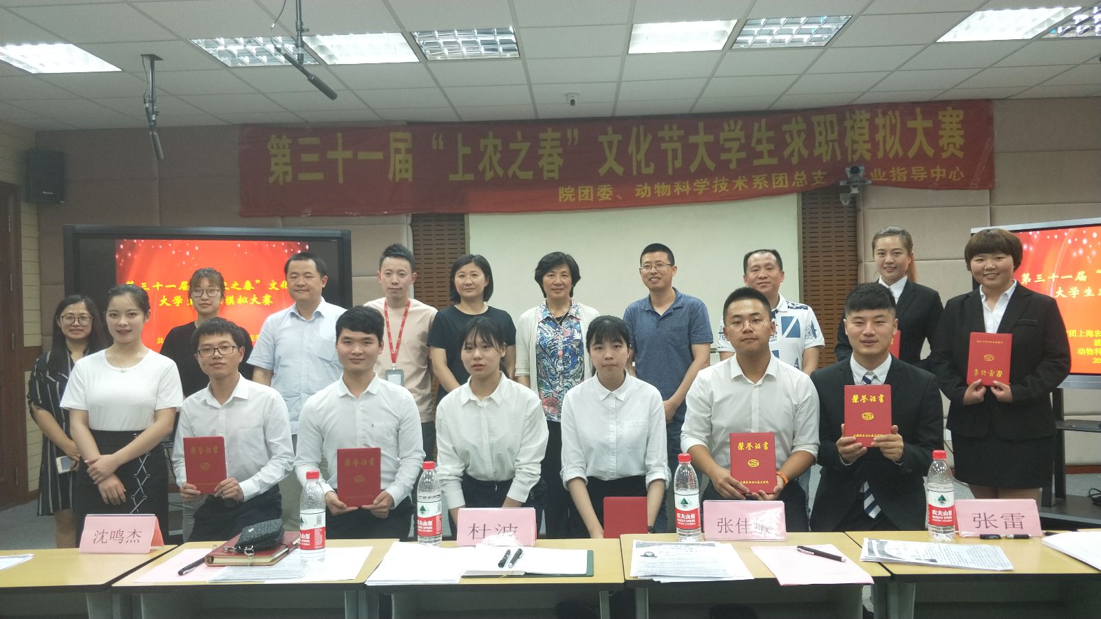 张佳敏宣读了大学生求职模拟大赛的获奖名单,并对选手们的表现进行了简单地点评,并寄语同学们要正确对待就业、择业和创业,提高应聘和就业技巧,增强心理素质,提高自身的应聘能力和社会竞争力。最终,园林166班吴玮琪获得大赛一等奖,宠物162班宋馨香和种子161班李佳玺获得二等奖,动医164班雪营、设施161班侯溢、质检161班敖绅航获得三等奖,水产151班叶涵翔和动医172班冯辰获得求职之星奖。