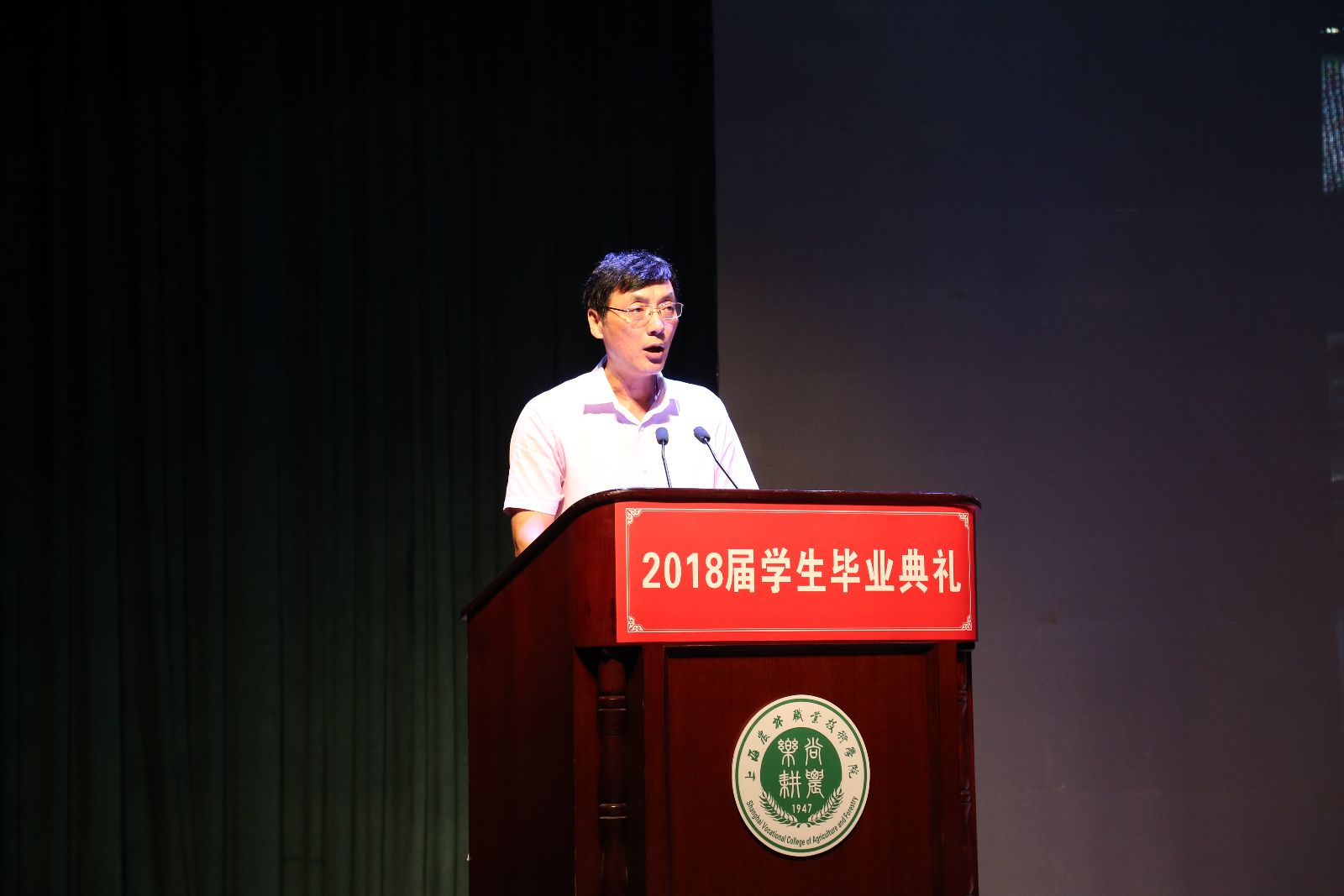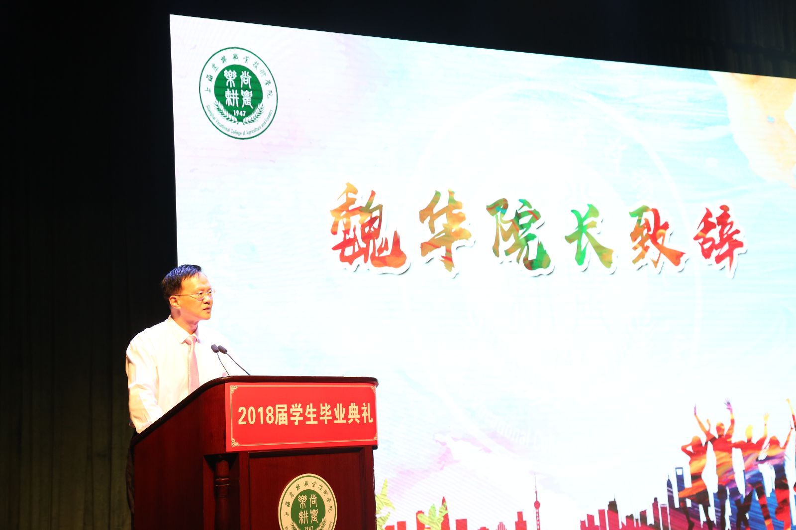 毕业典礼在庄严的国歌中正式拉开序幕。院长魏华致辞,他说,大学是人生奋斗的交换机,是青春奋斗的孵化器。同学们怀揣梦想走进上农,开启大学的奋斗之旅。从你们毕业起到2050年,这32年正是人生奋斗的黄金时代。要坚定理想和奋斗目标;知行合一、脚踏实地;热爱生活,超越自我。以后无论身处何方,能够坚持服务三农,保留一颗爱农村、爱农民的心,做到校歌所唱的那样“我们不会轻言放弃”。