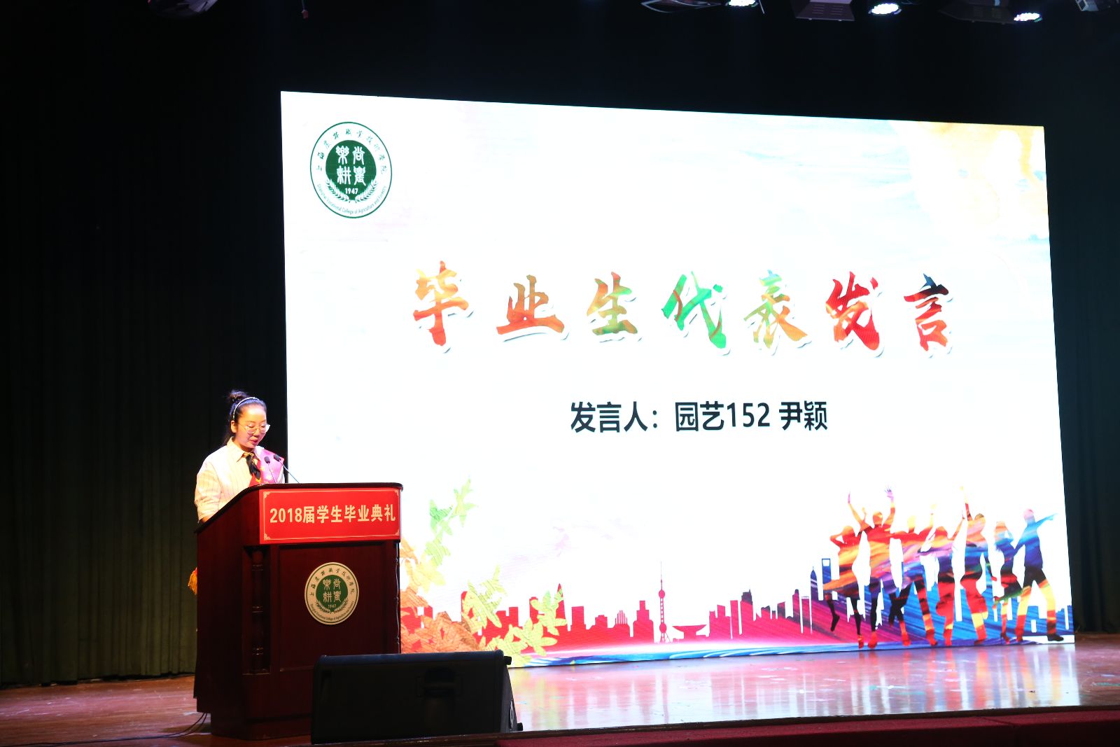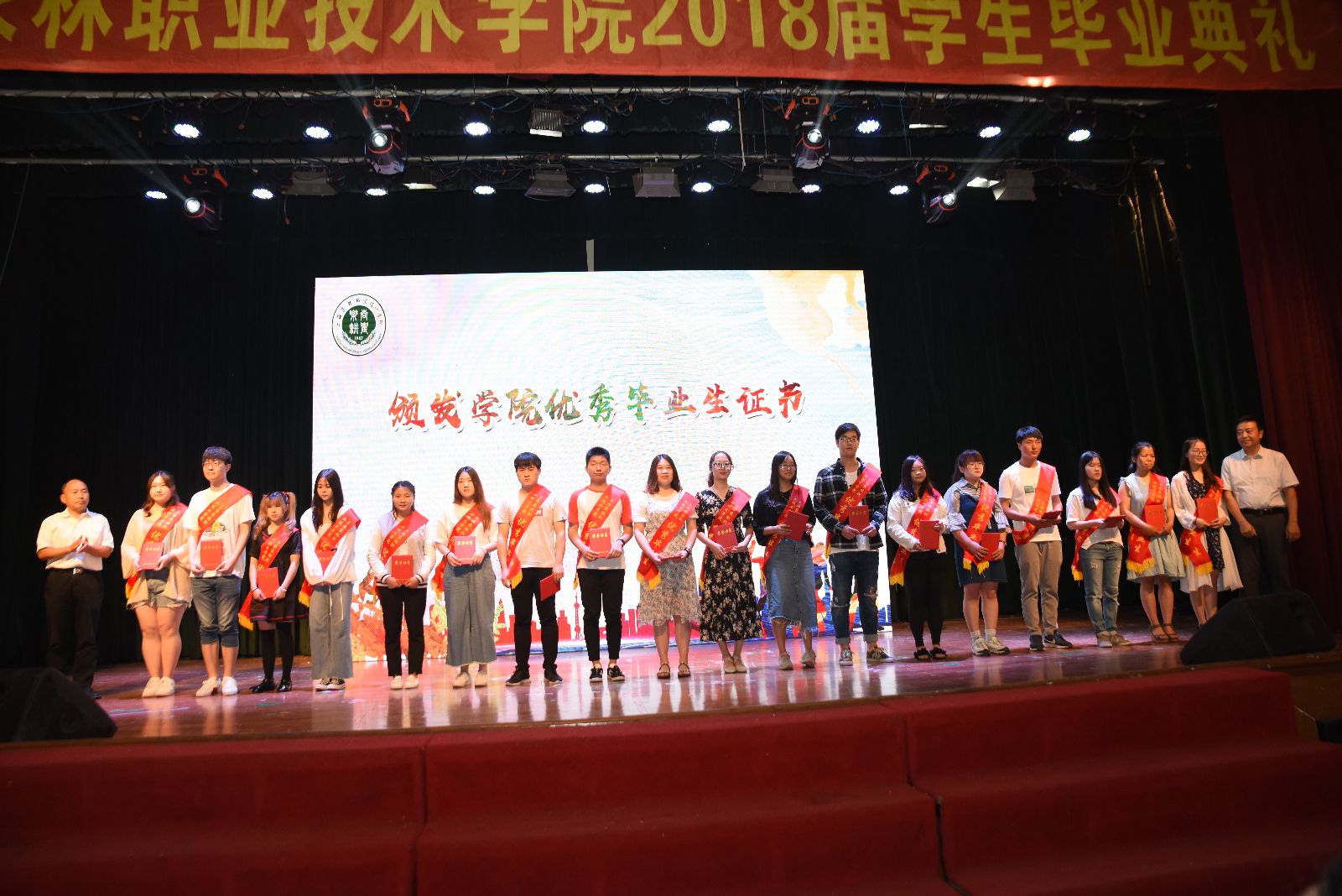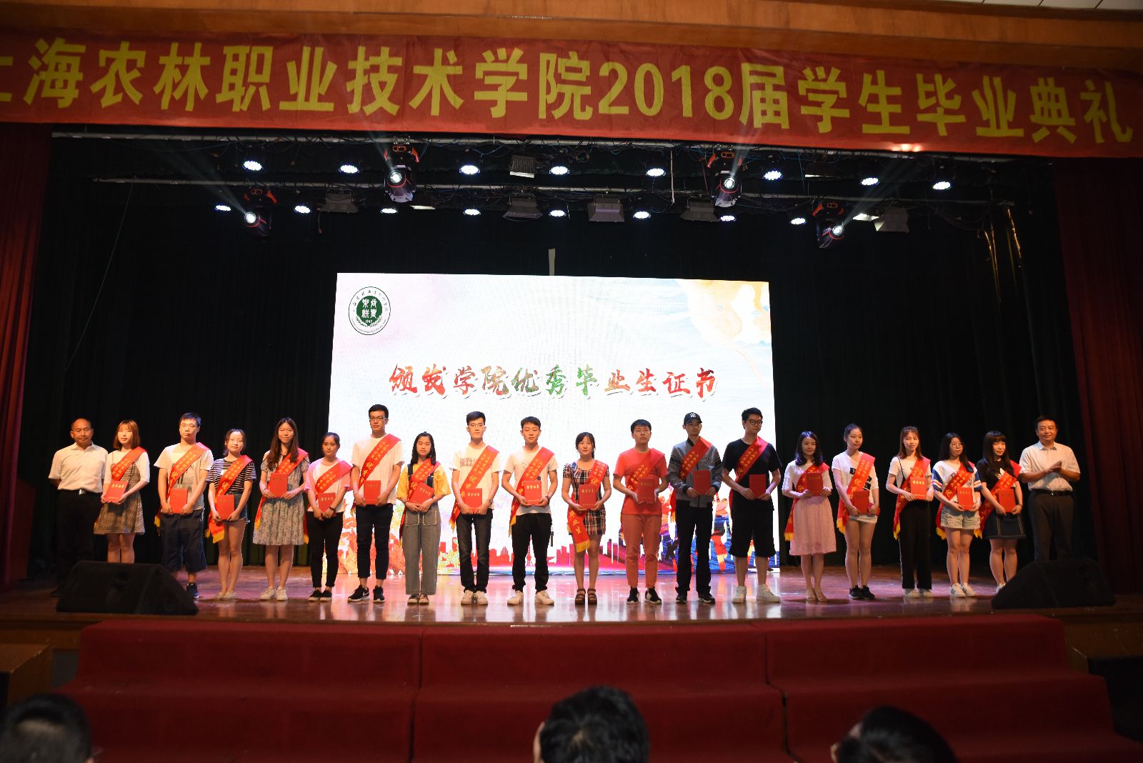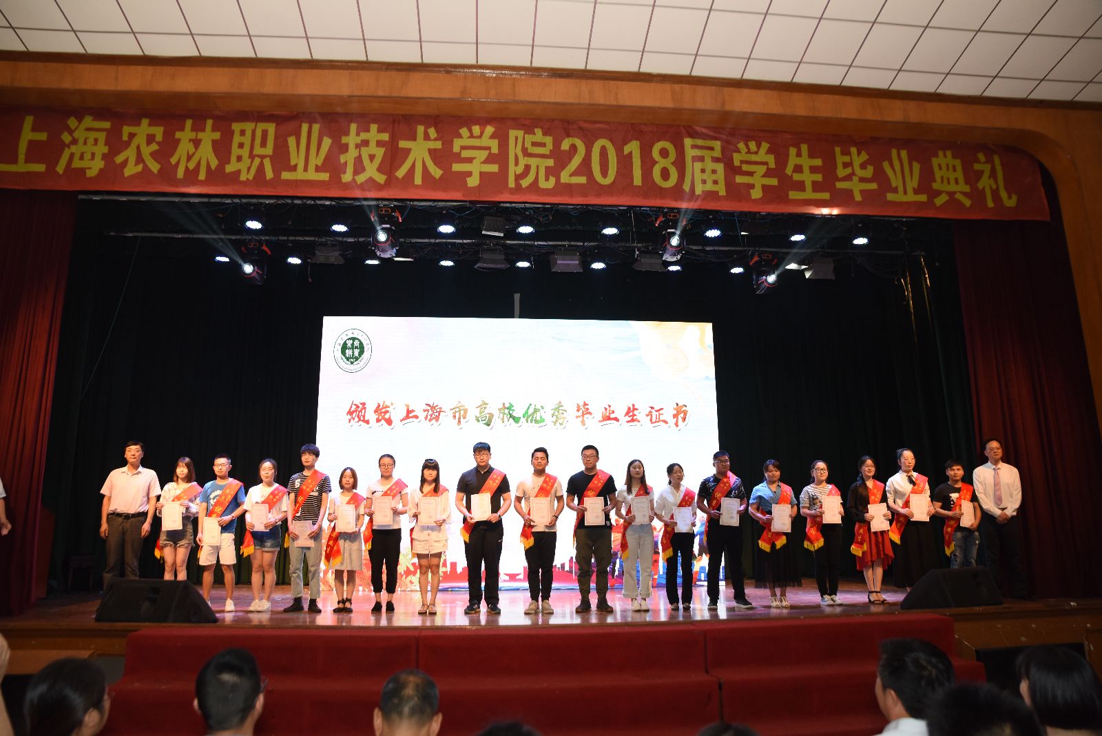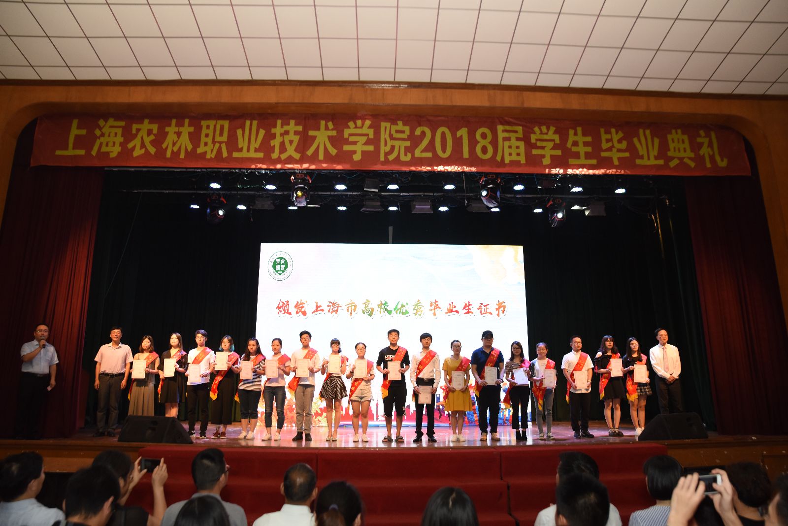 党委副书记、副院长俞锦禄《关于授予范南方等36名同学“2018年度上海农林职业技术学院优秀毕业生”荣誉称号的决定》和《关于朱亚等36名同学荣获“2018年度上海市高校优秀毕业生”荣誉称号的通知》,副院长谢锦平宣读《上海农林职业技术学院关于准予2018届毕业生毕业的决定》,颁发了毕业证书、学院及上海市高校优秀毕业生荣誉证书。