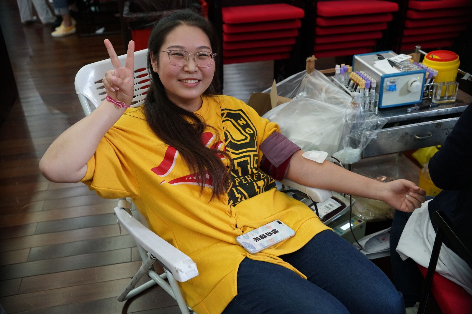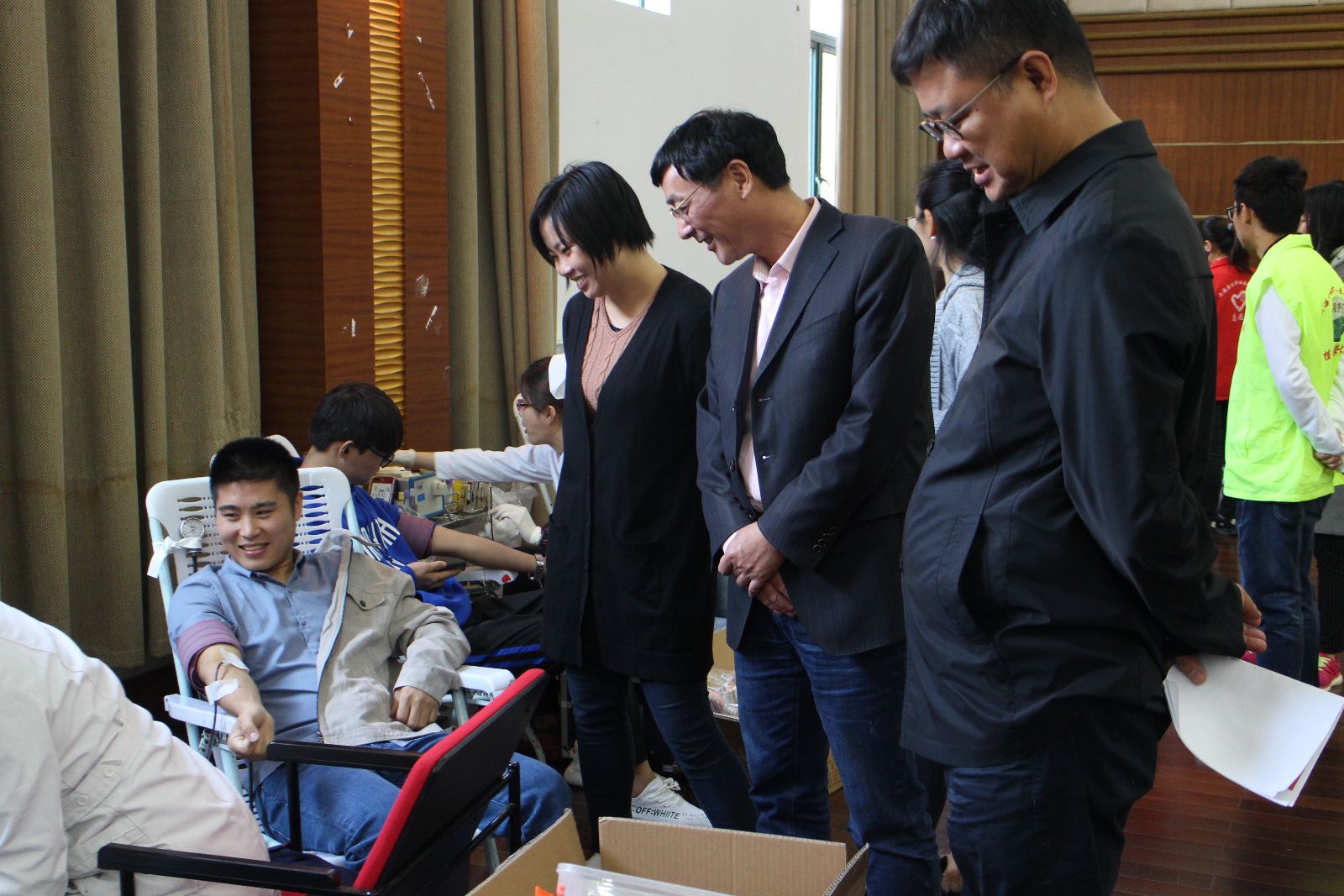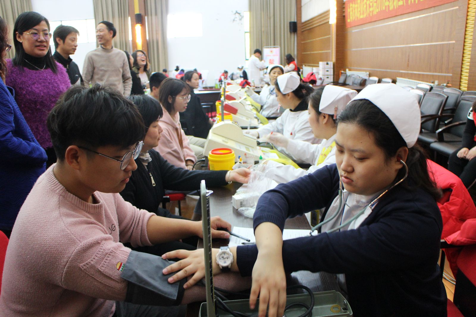 上午8点整,第一批参加献血的同学们就来到了献血场地,场内设置了休息区、体检区、献血区、休息区、领证区等区域,献血学生有序排队,依次进行各项环节,现场充满着爱心的温暖气息。“我献血,我光荣”,这是每一位献血师生发自内心的声音,大家的脸上都洋溢着一份幸福的神情。