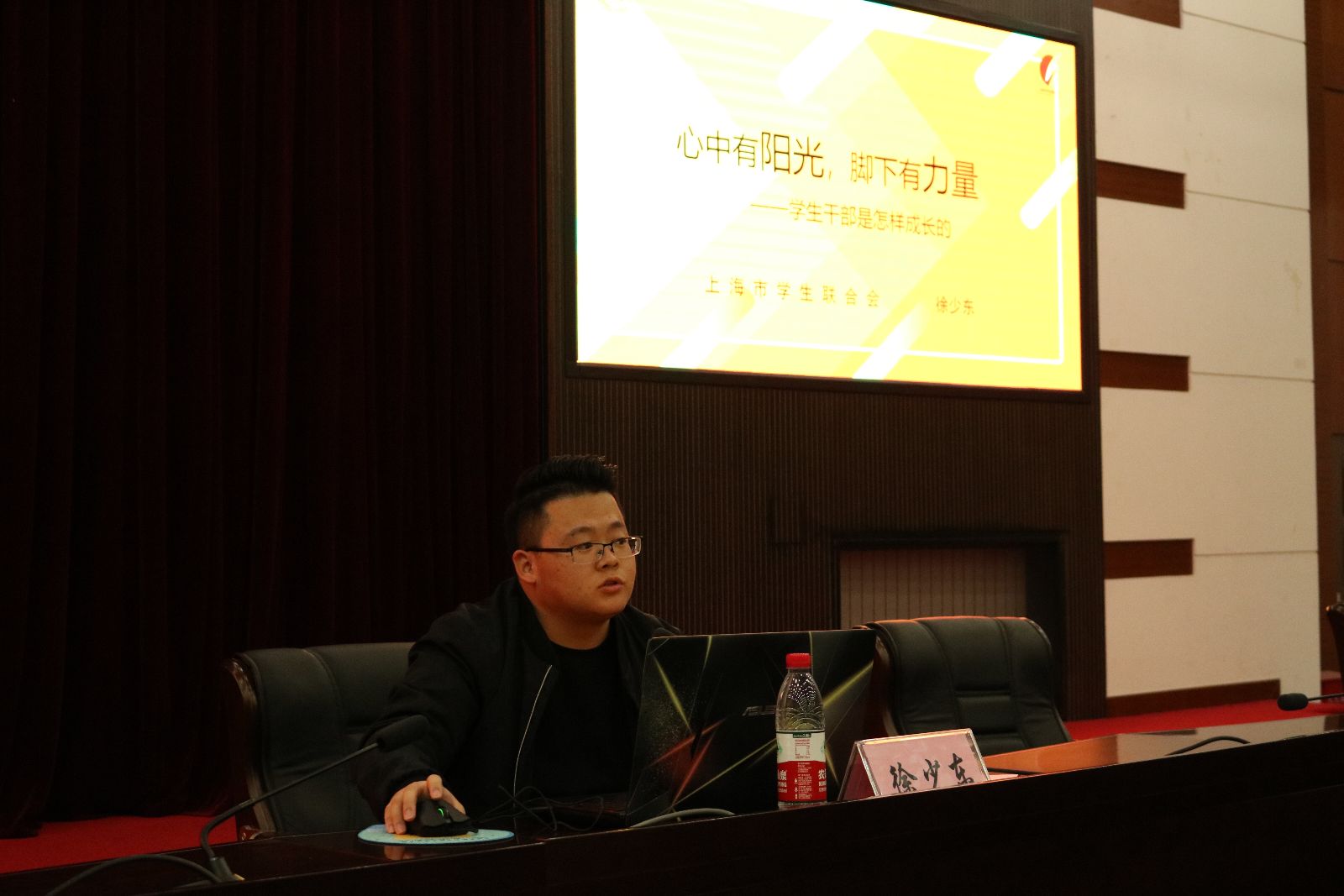 上海市学生联合会驻会主席徐少东受邀做首场培训,他讲到学生会是学生自己的群众组织,要在学院党委领导下和团委的指导下,遵循“自我管理、自我教育、自我服务、自我监督”的原则,牢牢把握“育人”这一根本任务,承载着丰富校园文化生活,参与学院有关学生事务的民主管理,服务广大师生的重要职责。徐少东希望学院学生会要进一步深化思想引领和制度改革,推进校园民主,并坚持好、完善好学生代表大会制度,切实增强学院学生会组织在学生中的凝聚力和号召力。