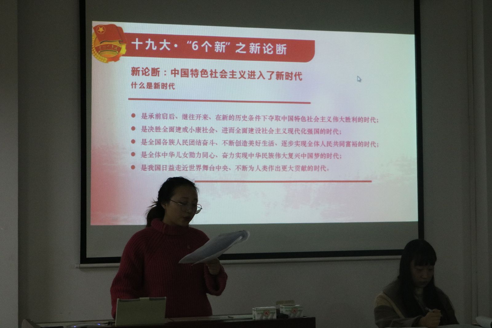 学生会主席吴玲从“原原本本学文本”“深入浅出探实质”“踏踏实实做实践”三个方面与同学们一起学习了党的十九大精神,并希望同学们要立报国之志、明学习之道、读无字之书,让新时代的要求在广大学生中真正落地见效。