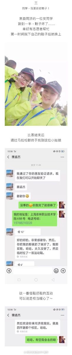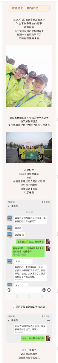 在这次马拉松比赛志愿服务中,发生了许多暖心的趣事,在赛程中有一位来自同济学校的选手跑到一半发现鞋子坏了又特别想跑完全程上海农林职业技术学院的青年志愿者在了解到情况后毫不犹豫地把自己的鞋子脱下为其助力,小姑娘说自己当时也没在意,事后参赛选手通过万人马拉松的群找到自己的老师,辗转找到小姑娘以示感谢,并邀请小姑娘到她的学校来玩,因为一双鞋子,让这次志愿服务变得更有青春的意义。