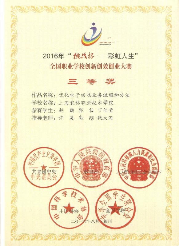 2016年“挑战杯--彩虹人生”全国职业学校创新创效创业大赛于2016年4月起发动,上海市农业学校薛王怡同学的参赛作品《上海快电电动汽车有限服务公司》及上海农林职业技术学院赵鹏同学的参赛作品《优化废旧电子回收业务流程和方法》申报参赛。经过市赛初选后,赵鹏同学的参赛作品进入全国总决赛,在层层评比后最终获得2016年“挑战杯—彩虹人生”全国职业学校创新创效创业大赛创意类项目生产工艺革新和工作流程优化组三等奖。这也是我院学生第一次荣获“挑战杯--彩虹人生”国家级奖项。