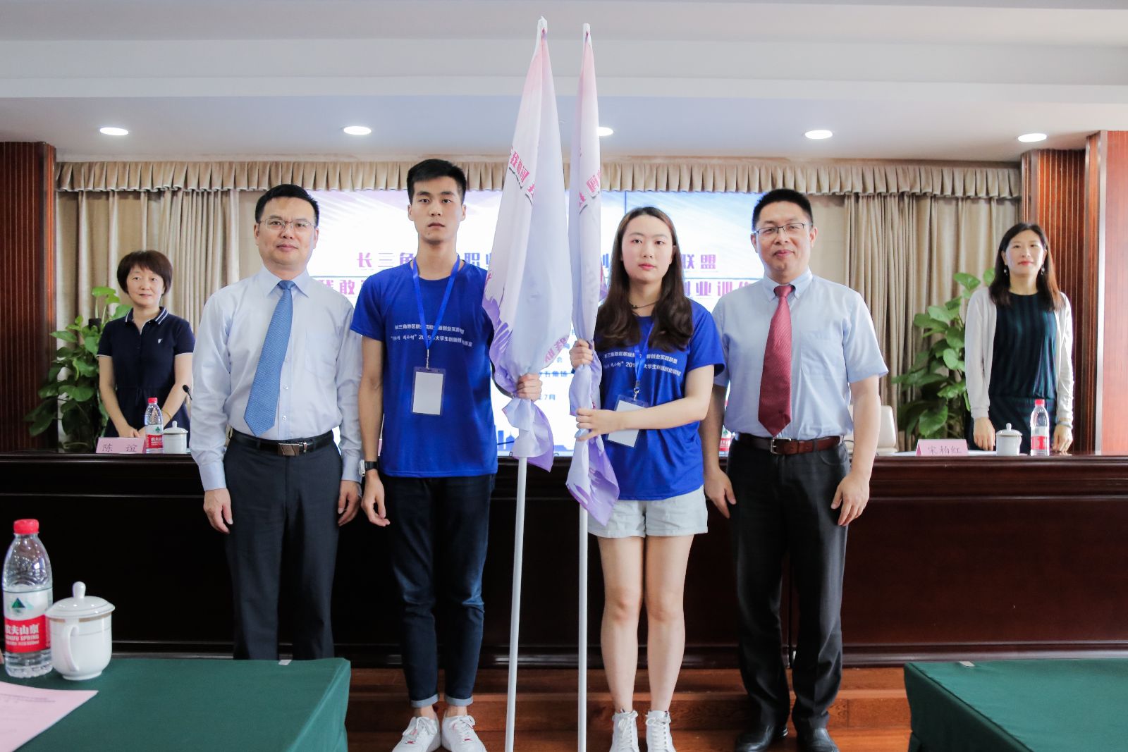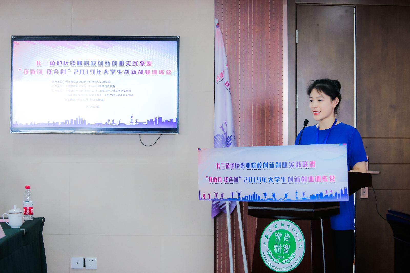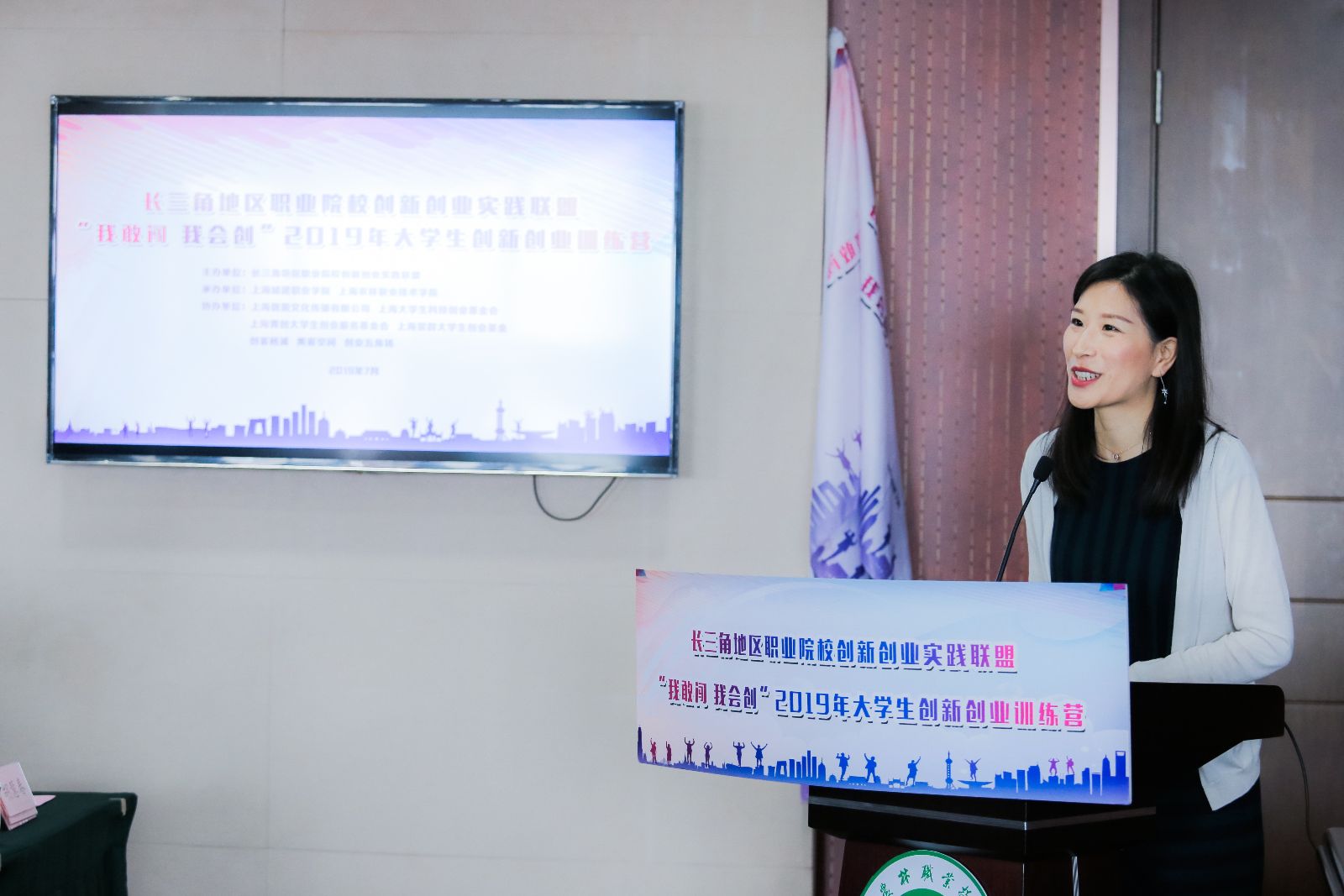 长三角地区职业院校创新创业实践联盟秘书长、上海城建职业学院创新创业学院执行院长宋柏红介绍了此次训练营安排,训练营为期6天,采取专题报告、互动实训、创业真人图书馆、现场教学、实践拓展、项目路演等形式进行;农经系旅管182班韩提提同学代表全体营员在发言中表示将学有所成、学有所获,把自身的专业技能和创新思维相结合,明确自身的发展方向。开营仪式上,褚敏与蔡红分别为营员代表进行授旗。