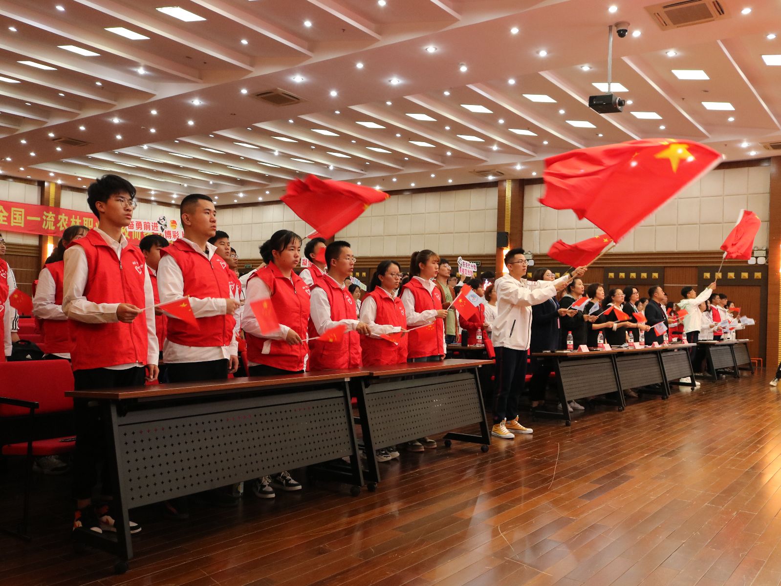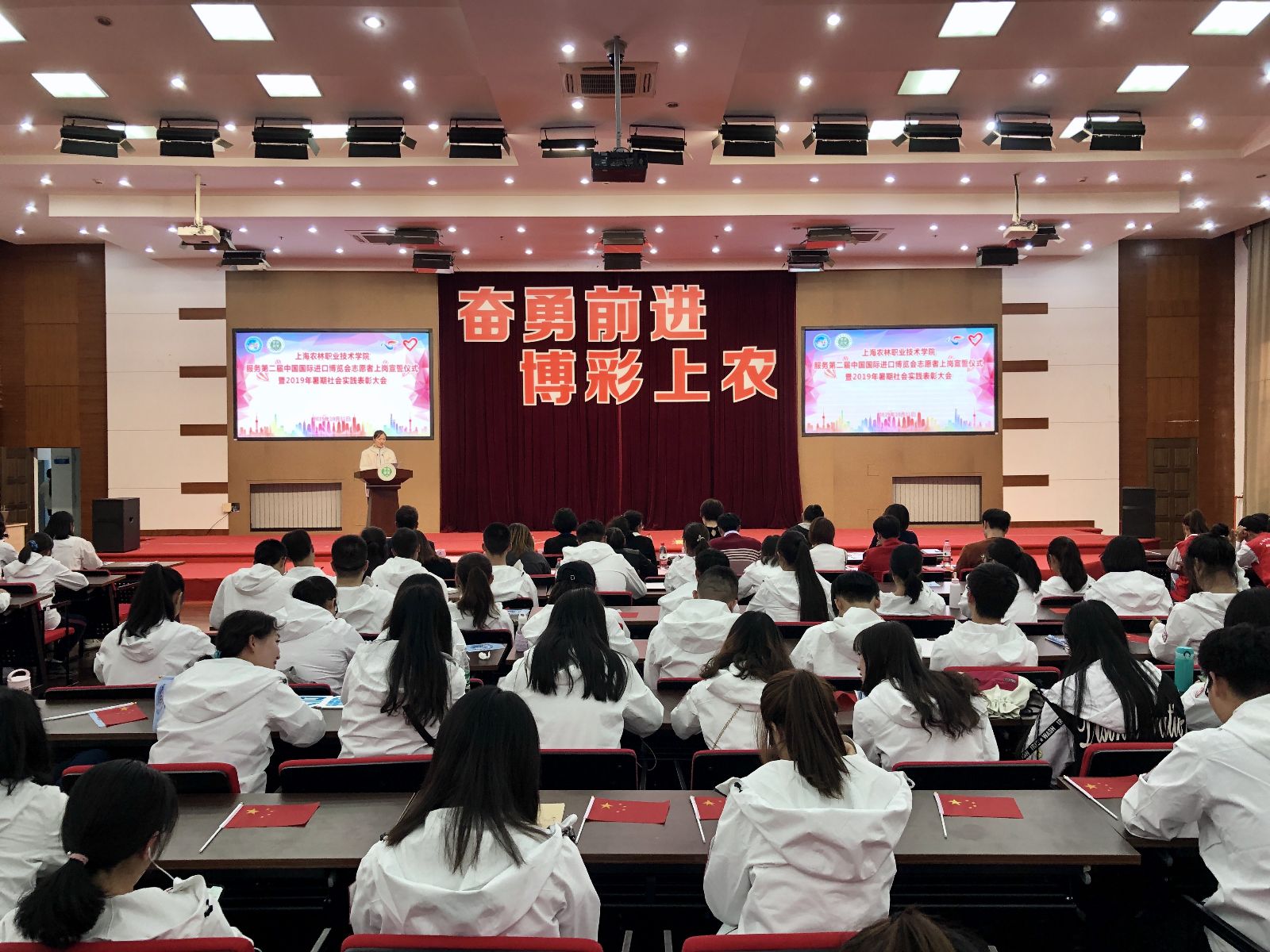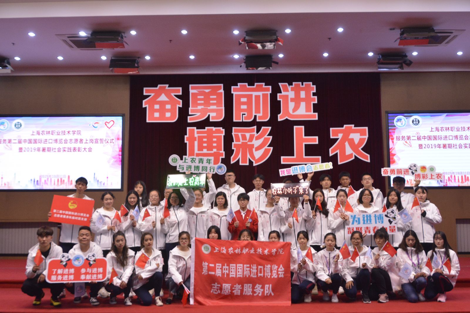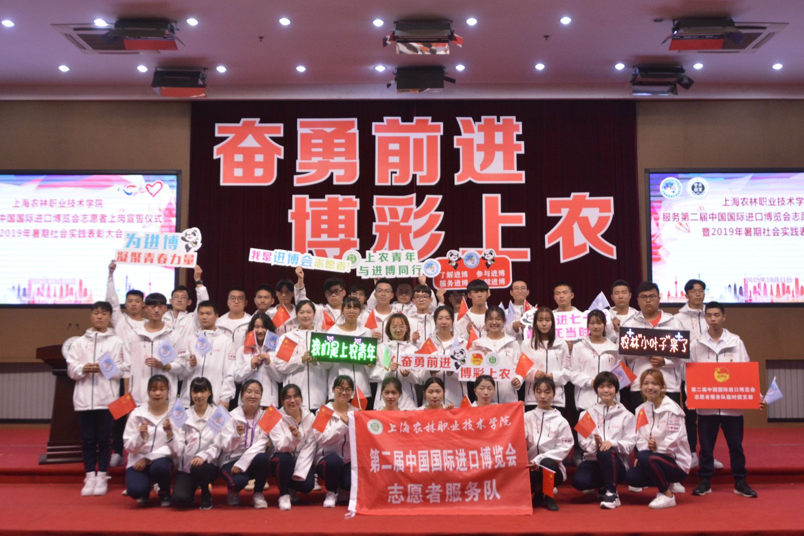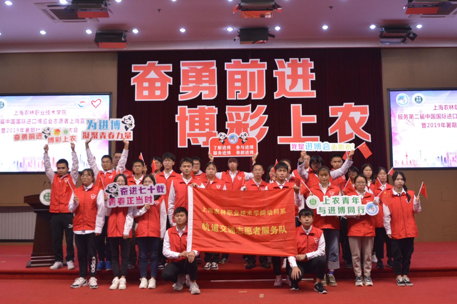 大会在全场高唱《歌唱祖国》声中结束。据悉,学院作为服务第二届进博会6所高职院校其中之一,在学院党委和团市委的领导、指导下,院团委高度重视此次进博会志愿服务,于暑期在全院范围内进行招募,并一一进行严格面试,最终确定志愿者人数140人,分别参与后勤保障、协调联络、公交接驳等志愿服务。同时学院还招募50名轨交志愿者,将分批前往人民广场站、虹桥火车站、虹桥T1航站楼站、豫园站、陕西南路站、中春路站等站点,提供地铁双语引导、问询等服务工作。植科系辅导员孔德颖、动科系辅导员张陈华作为志愿者带队将全程参与本届进博会志愿服务。