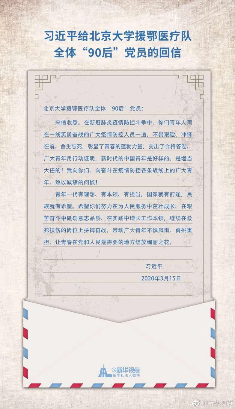中共中央总书记、国家主席、中央军委主席习近平3月15日给北京大学援鄂医疗队全体“90后”党员回信,向他们和奋斗在疫情防控各条战线上的广大青年致以诚挚的问候。