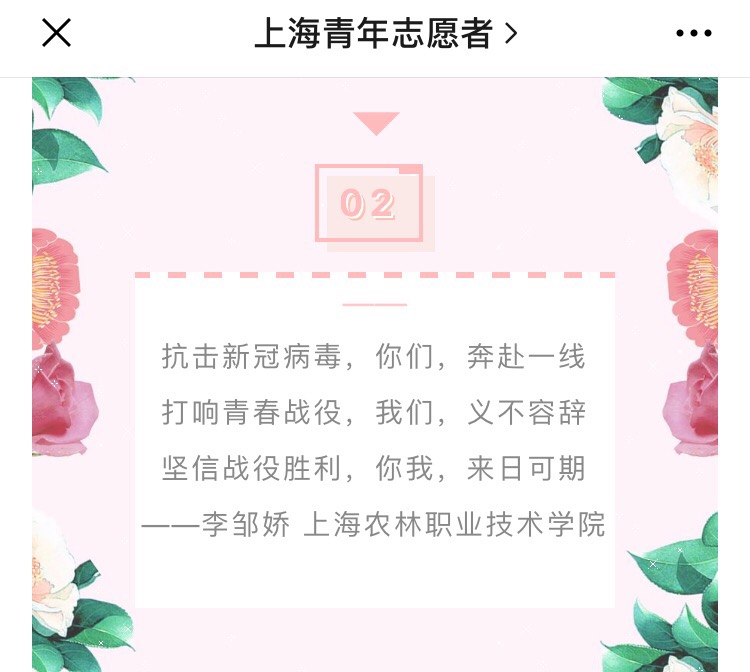 3月19日,上海青年志愿者微信公众号发布“战疫有我在丨沪上学子们才华横溢的三行诗抢先看”推文,我院风景园林技术系风景181班李邹娇同学创作的三行诗被公众号发表。