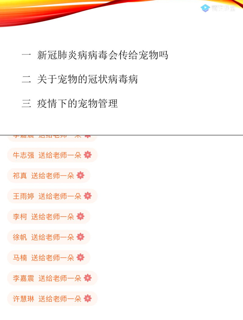 其次,王老师分别介绍了犬、猫的冠状病毒,即犬冠状病毒仅影响犬,不影响人和猫;猫冠状病毒仅影响猫,不影响人和犬。针对同学们普遍关心的疫情下如何科学养宠这一话题,王老师也分别介绍了养宠室内、室外管理,人和宠物接触的管理以及宠物患病管理的知识。最后王老师呼吁:在这特殊的时期,不应该盲目的轻信谣言,我们更提倡的是在重视疫情的同时,善待宠物、做好宠物防护,科学养宠、文明养宠。决不能将野生动物当作宠物饲养,更不能食用野生动物。