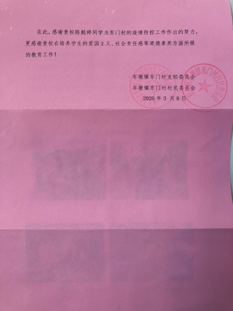 在此,感谢贵校陈懿婷同学为东门村的疫情防控工作作出的努力,更感谢贵校在培养学生的爱国主义、社会责任感等道德素养方面所做的教育工作!