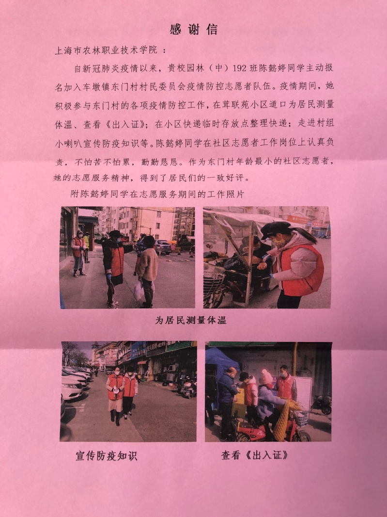 自新冠肺炎疫情以来,贵校园林(中)192班陈懿婷同学主动报名加入车墩镇东门村村民委员会疫情防控志愿者队伍。疫情期间,她积极参与东门村的各项疫情防控工作,在茸联苑小区道口为居民测量体温、查看《出入证》;在小区快递临时存放点整理快递;走进村组小喇叭宣传防疫知识等。陈懿婷同学在社区志愿者工作岗位上认真负责,不怕苦不怕累,勤勤恳恳。作为东门村年龄最小的社区志愿者,她的志愿服务精神,得到了居民们的一致好评。
