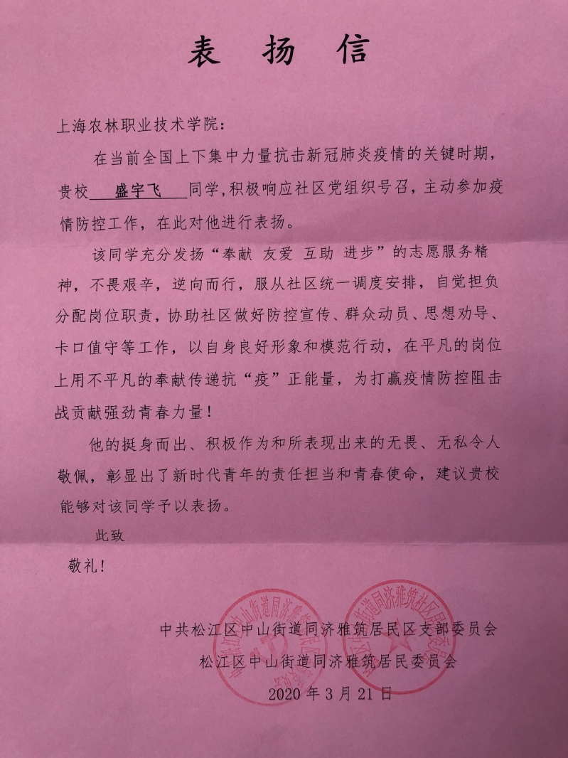 在当前全国上下集中力量抗击新冠肺炎疫情的关键时期,贵校盛宇飞同学,积极响应社区党组织号召,主动参加疫情防控工作,在此对他进行表扬。