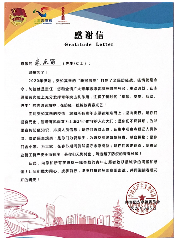 面对突如其来的疫情,您和所有青年志愿者知难而上,逆向疾行。是你们挺身而出,冒着寒风雨雪为上海24小时守护入市大门;是你们不厌其烦,为邻里宣传防疫知识、排摸人员信息;是你们勇敢无畏,在集中观察点登记人员体温、协助隔离观察;是你们为爱举手,为防疫前线慷慨解囊、献血捐物;是你们舍小家、为大家,在春节期间仍然坚守志愿岗位;是你们奔走巡查,使得企业复工复产安全而有序;是你们无悔付出,筑造起了防疫的青春长城!