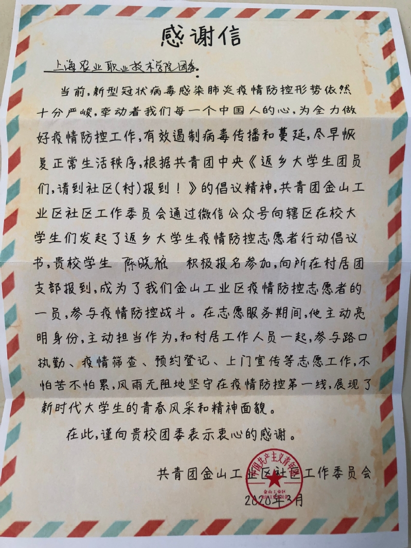 近日,学院4名参与疫情防控志愿服务的同学收到来自服务单位的感谢信。