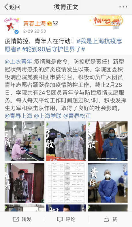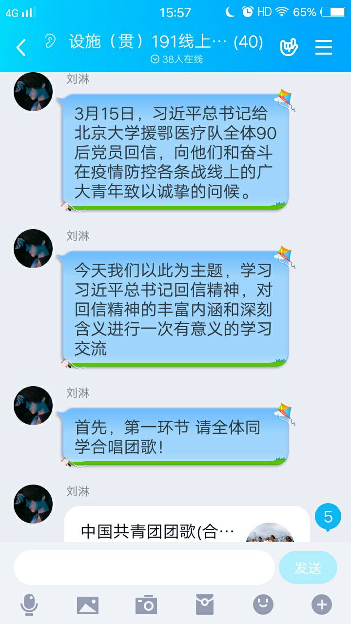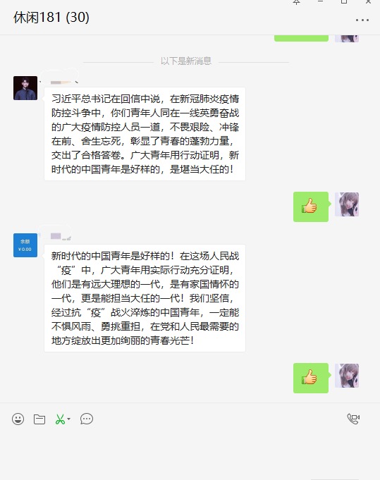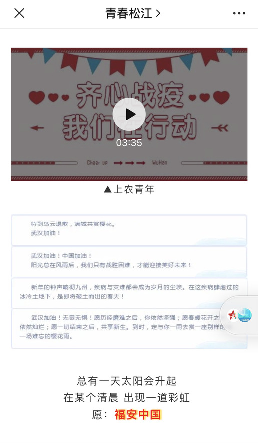 3月15日,习近平总书记给北京大学援鄂医疗队全体“90后”党员的回信带给上农青年们莫大的支持与感动,迅速在团员青年中掀起学习回信精神的热潮。院团委第一时间发出关于组织开展学习《习近平给北京大学援鄂医疗队全体“90后”党员的回信》线上主题团日活动的通知,大家纷纷用“学、说、唱、写、绘”等形式发出铿锵有力的青年之声,表示会始终牢记习近平总书记的教诲,用实际行动证明,新时代的中国青年是好样的,是堪当大任的。