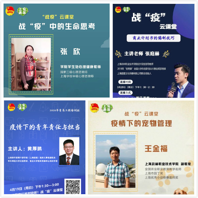 在引导广大同学科学防控疫情的同时,根据团市委部署,院团委不断创新教育形式,与“第一课堂”形成良性互动,与“三全育人”工作有序衔接,积极开展战“疫”云课堂5场,将青年思想政治引领与防疫知识科普、专业学习、心理健康疏导等内容有机融入,推动线上教育入脑入心。