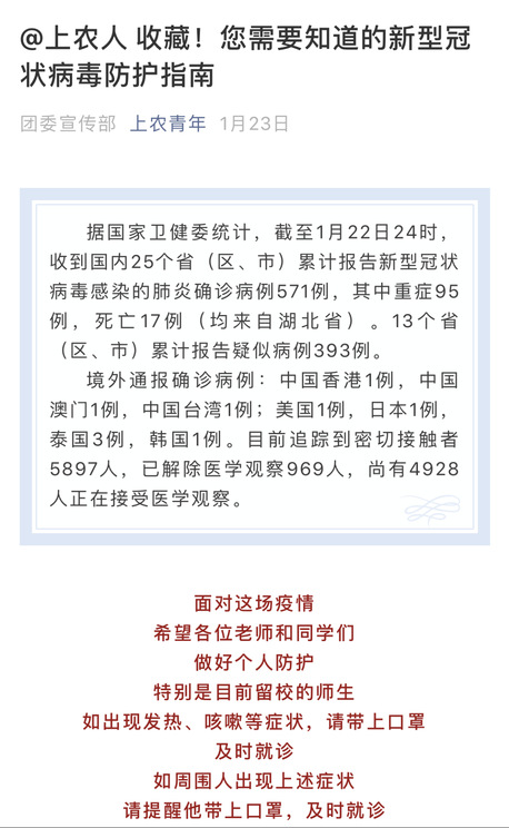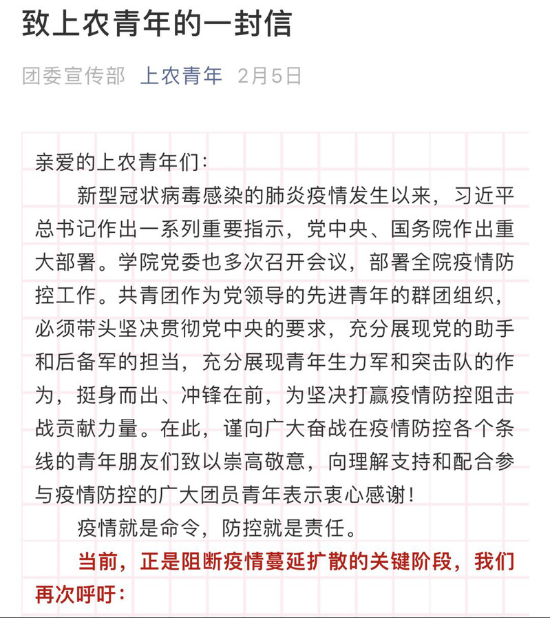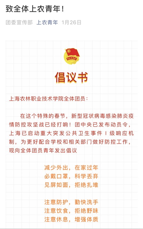1月底,面对疫情防控的严峻形势,院团委积极传达院党委、团市委有关防疫工作的精神,第一时间向全院团员青年发布《致上农青年的一封信》《致全体上农青年倡议书》《我是上农青年,我践行》等内容,发挥团组织战斗堡垒作用,强化团学干部示范作用。同时,结合团员青年喜闻乐见的方式,上农青年微信平台定期推送新型冠状病毒感染的肺炎诊疗方案、防护指南、口罩选择和使用全指南等内容,加强疫情防控教育,普及防疫知识,引导学生科学认识、理性应对疫情,不信谣、不传谣、不造谣,为打赢疫情防控阻击战打下坚实思想基础。