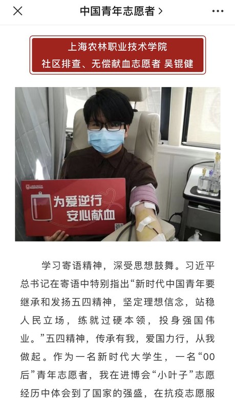 上海农林职业技术学院社区排查、无偿献血志愿者吴锟健: