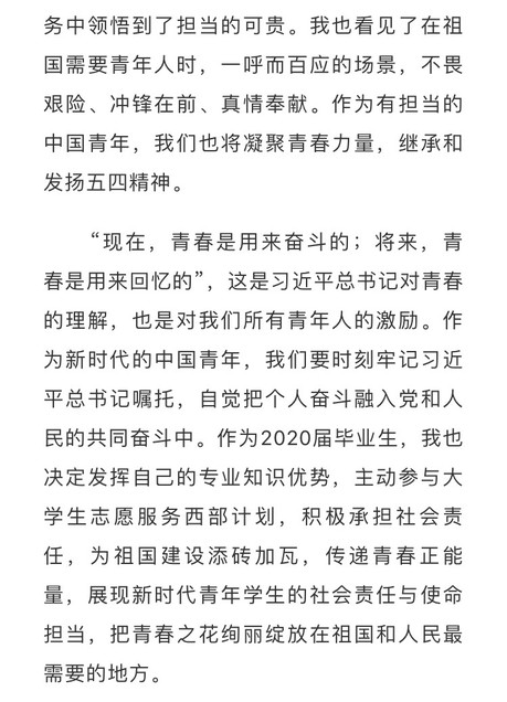 “现在,青春是用来奋斗的;将来,青春是用来回忆的”,这是习近平总书记对青春的理解,也是对我们所有青年人的激励。作为新时代的中国青年,我们要时刻牢记习近平总书记嘱托,自觉把个人奋斗融入党和人民的共同奋斗中。作为2020届毕业生,我也决定发挥自己的专业知识优势,主动参与大学生志愿服务西部计划,积极承担社会责任,为祖国建设添砖加瓦,传递青春正能量,展现新时代青年学生的社会责任与使命担当。把青春之花绚丽绽放在祖国和人民最需要的地方。