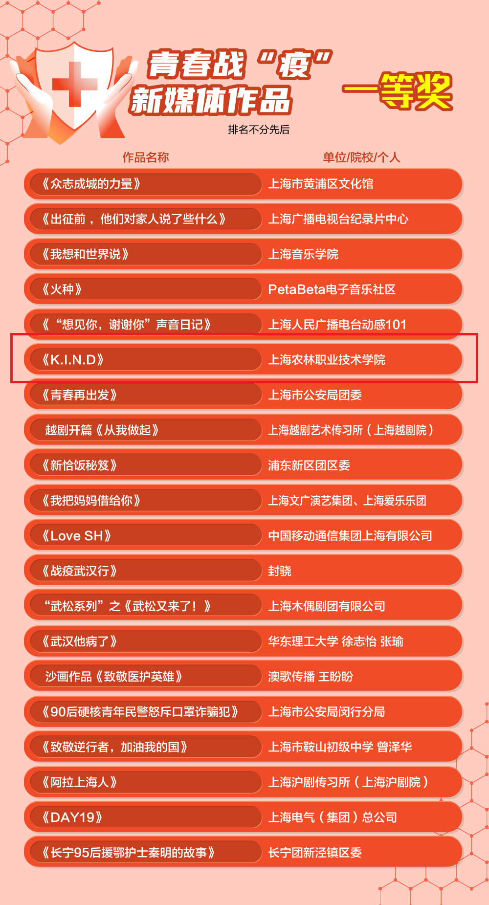 7月1日,青春上海新媒体公众平台公布上海共青团青春战“疫”新媒体作品获奖名单,我院园林(中)172班陆喻同学的原创音乐《K.I.N.D》获青春战“疫”新媒体作品一等奖。