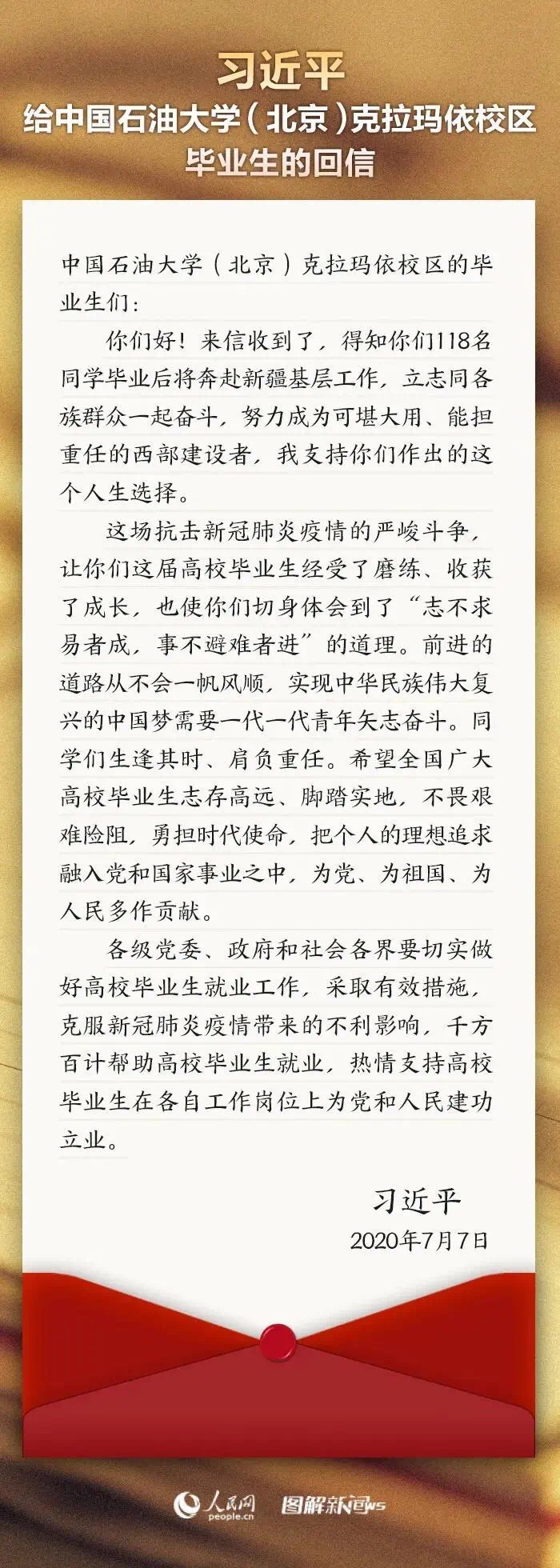 7月7日,习近平总书记给中国石油大学(北京)克拉玛依校区毕业生回信,肯定他们到边疆基层工作的选择,对广大高校毕业生提出殷切期望。习近平总书记的谆谆嘱托,让广大上农青年倍感振奋,大家纷纷表示,要用实际行动担起时代使命,为中华民族伟大复兴的中国梦矢志奋斗。