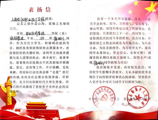近日,我院收到中共范县杨集乡委员会、范县杨集乡人民政府关于表扬农业经济管理系旅管182班梅明川同学在当地疫情防控志愿服务中努力付出的来信。全文如下: