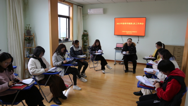 3月4日,在学生事务楼团体辅导室,院团委召开新学期工作会议,院团委、各系团总支共11人参加会议。