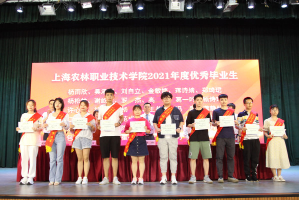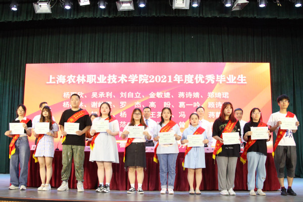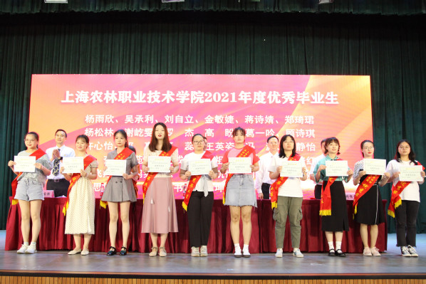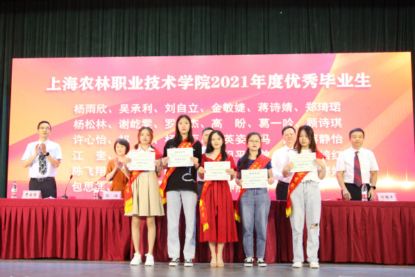 副院长谢锦平宣读“上海农林职业技术学院关于准予2021届毕业生毕业的决定”;副院长费国强宣读“上海农林职业技术学院2021年度优秀毕业生表彰决定”和“2021年度上海市优秀毕业生表彰决定”,党政领导现场颁发上海市高校优秀毕业生、学院优秀毕业生和学生毕业证书。