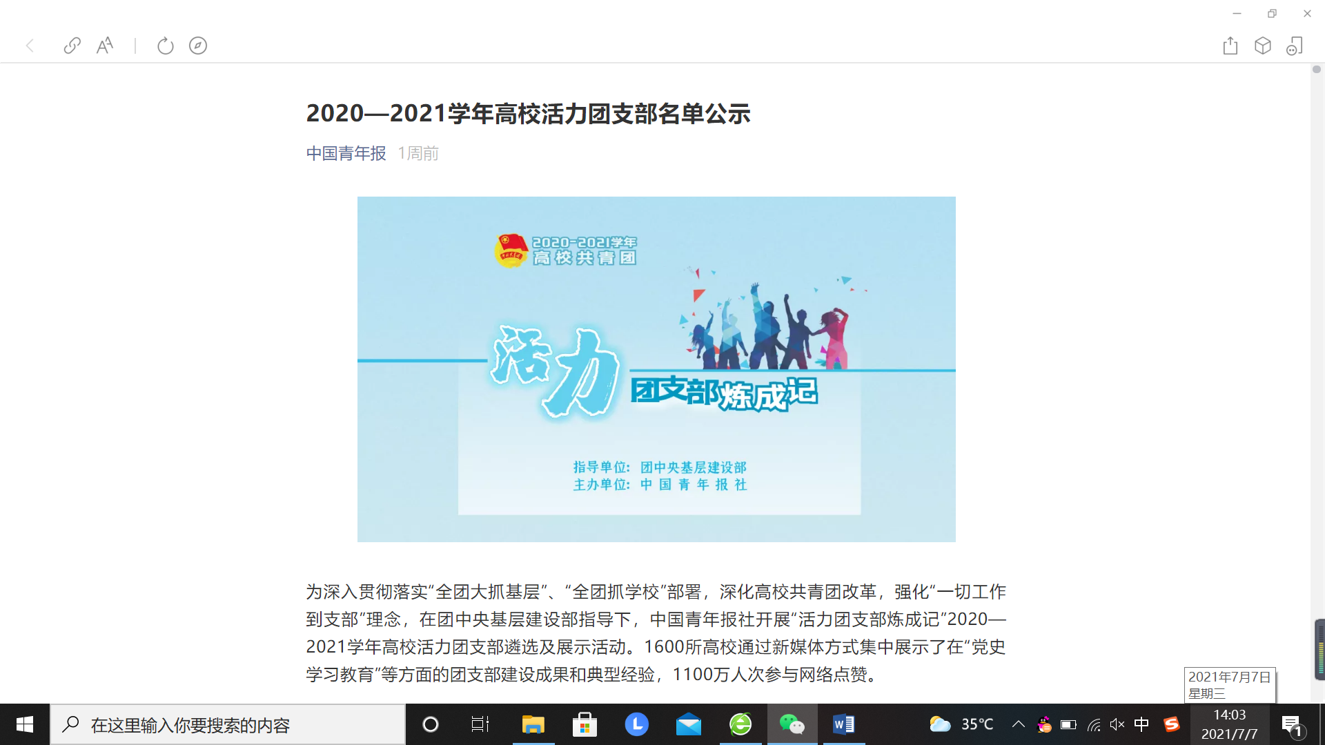 我院从今年3月积极开展“活力团支部”“优秀团干部”“优秀团员”“最美团支书”评选活动,精心策划、认真组织、积极宣传、审核和选拔,从全院推荐的21个团支部中选出园林(中高贯通)172班团支部参加上海市“活力团支部”创建遴选活动。经过上海市学工委的严格筛选,该团支部凭借优秀事迹和突出成绩成功入围团中央学校部的网上投票环节,经过紧张而激烈的选拔,最终获评为2020—2021学年全国高校“活力团支部”荣誉称号。