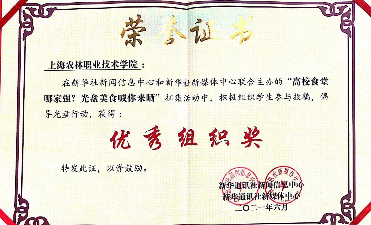 近日,在新华社新闻信息中心和新华社新媒体中心联合主办的“高校食堂哪家强?光盘美食喊你来晒”征集活动中,学院积极组织学生参与投稿,倡导光盘行动,获得优秀组织奖。