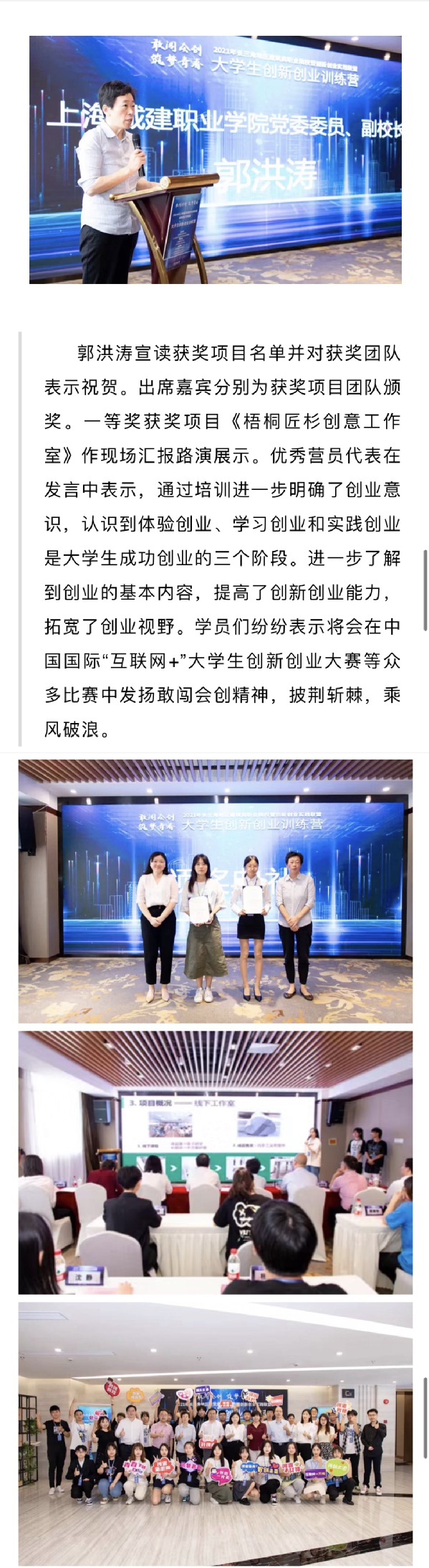 近期,2021年长三角地区建筑类职业院校暨创新创业实践联盟大学生创新创业训练营圆满完成各项学习、培训任务顺利结营,让我们一起通过镜头来回顾整个训练营的精彩瞬间。