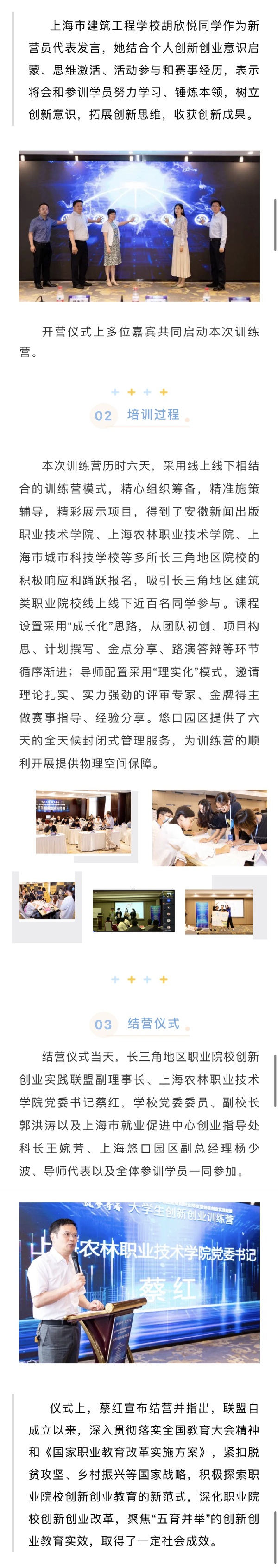 结营仪式当天,长三角地区职业院校创新创业实践联盟副理事长、上海农林职业技术学院党委书记蔡红,上海城建职业学院党委委员、副校长郭洪涛以及上海市就业促进中心创业指导处科长王婉芳、上海悠口园区副总经理杨少波、导师代表以及全体参训学员一同参加。