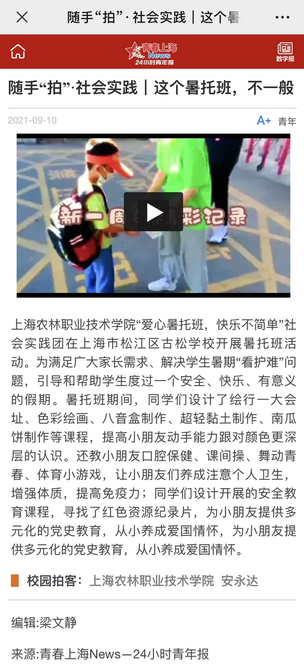 上海农林职业技术学院“爱心暑托班,快乐不简单”社会实践团在上海市松江区古松学校开展暑托班活动。为满足广大家长需求、解决学生暑期“看护难”问题,引导和帮助学生度过一个安全、快乐、有意义的假期。暑托班期间,同学们设计了绘行一大会址、色彩绘画、八音盒制作、超轻黏土制作、南瓜饼制作等课程,提高小朋友动手能力跟对颜色更深层的认识。还教小朋友口腔保健、课间操、舞动青春、体育小游戏,让小朋友们养成注意个人卫生,增强体质,提高免疫力;同学们设计开展的安全教育课程,寻找了红色资源纪录片,为小朋友提供多元化的党史教育,从小养成爱国情怀,为小朋友提供多元化的党史教育,从小养成爱国情怀。