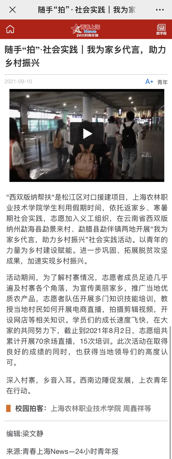 “西双版纳帮扶“是松江区对口援建项目,上海农林职业技术学院学生利用假期时间,依托返家乡、寒暑期社会实践,志愿加入义工组织,在云南省西双版纳州勐海县勐景来村、勐腊县勐伴镇两地开展“我为家乡代言,助力乡村振兴”社会实践活动。以青年的力量为乡村建设赋能。进一步巩固、拓展脱贫攻坚成果,加速实现乡村振兴。